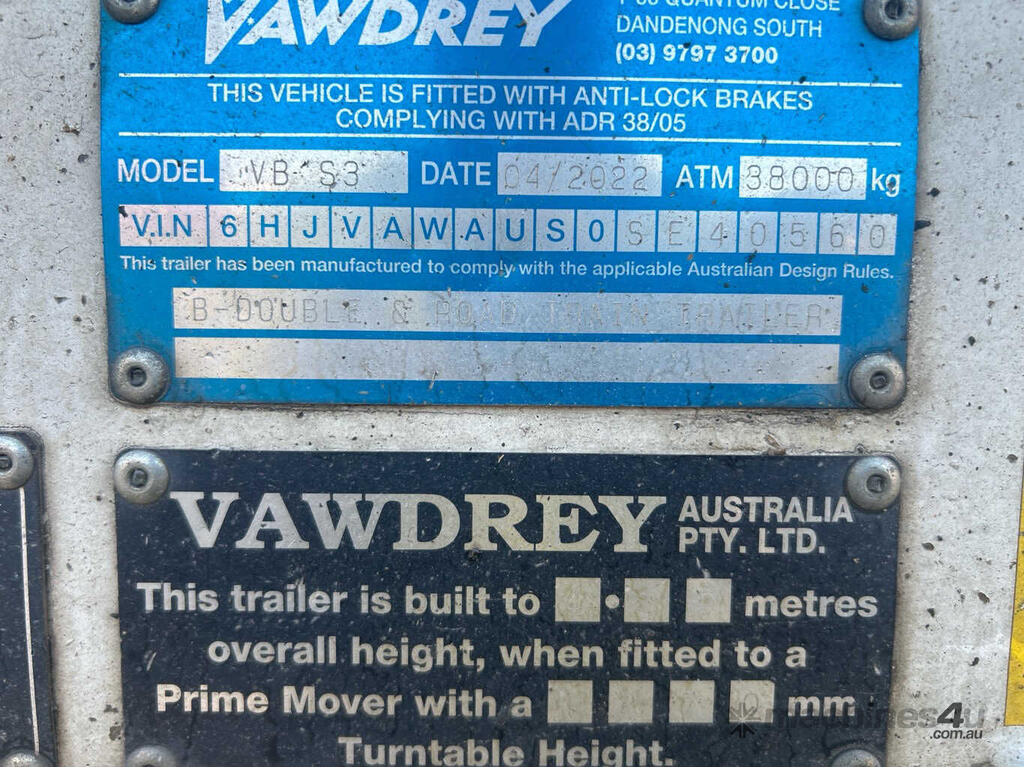 CP: 04/2022,Vawdrey,VB S3,Tri Axle Drop Deck Curtainsider B Trailer,761919 (Kms. Showing on Hubometer),Colour: Blue,Rego. No: YQ25QJ QLD,VIN: 6HJVAWAUS0SE40560,Sold with No Plates