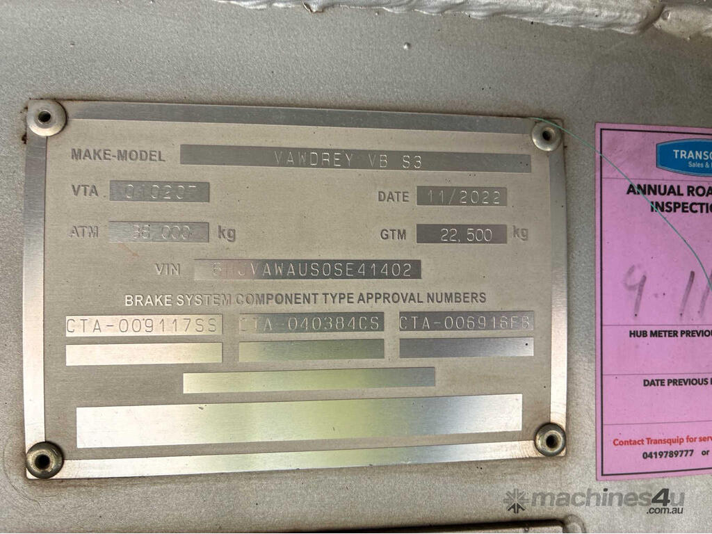 CP: 11/2022,Vawdrey,VB S3,Tri Axle Flat Top Curtainsider B Trailer,319621 (Kms. Showing on Hubometer),Colour: Silver,Unregistered,VIN: 6HJVAWAUS0SE41402,Sold with No Plates