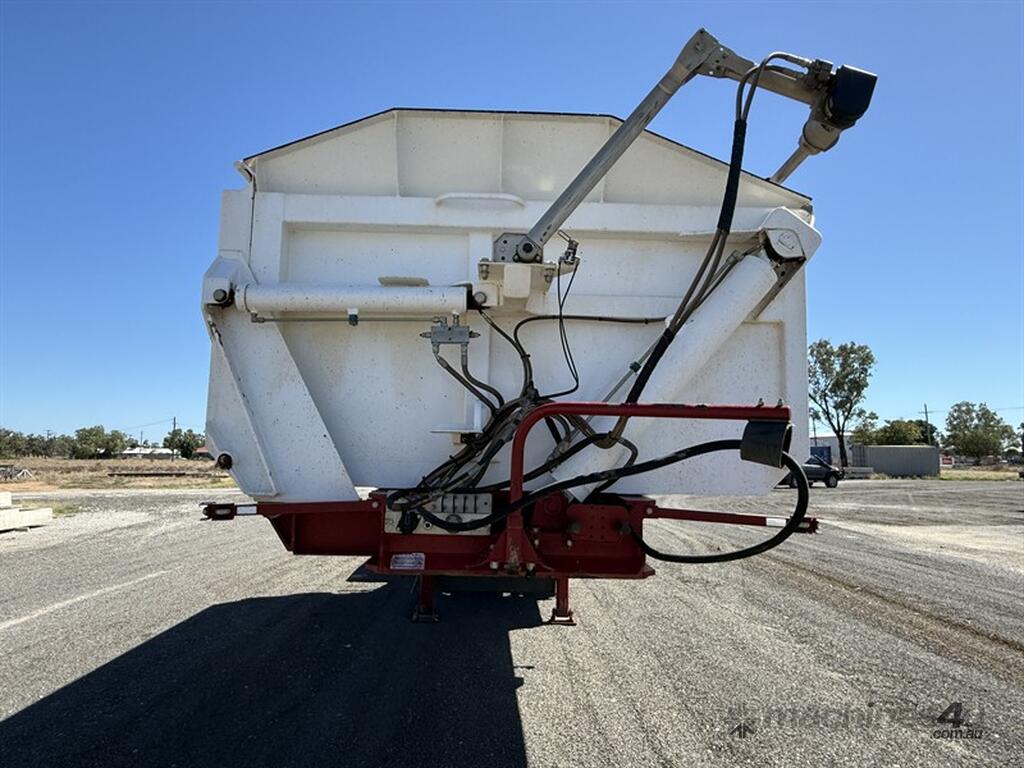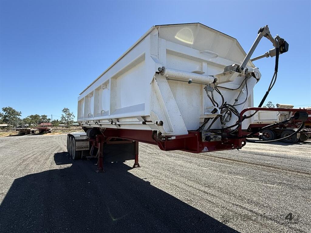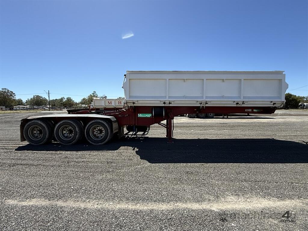 2023 HAULMARK SIDE TIPPING A TRAILER. VIN 6H93STAEFPBAA1015. Spring suspension. 10 stud rims. Electric roll over tarp. Holland fixed greaseless turntable. Automatic slack adjusters. Drum brakes. Bin measures 5.9 metres long. Located Walgett, NSW