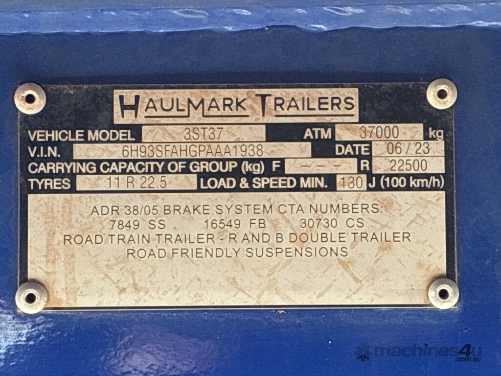 CP: 06/2023,Haulmark,3ST37,Tri Axle Flat Top A Trailer,37041 (Kms. Showing on Hubometer),Colour: Blue,Unregistered,VIN: 6H93SFAHGPAAA1938,Sold with No Plates