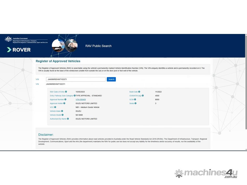 CP: 02/2023,Built: 11/2022,Isuzu,NNR 45-150,Pantech,Automatic,Spring,4 Cyl,Diesel,50640 (Kms. Showing on Odometer),1917 (Hrs. Showing on Hour meter),Colour: White,Rego. No: 291HJ2 QLD,VIN: JAANNR85HM7102371,Key No: 288,GVM: 4500,GCM: 8000,Sold with No Plates,Key No: 288