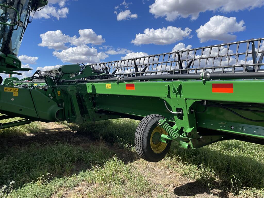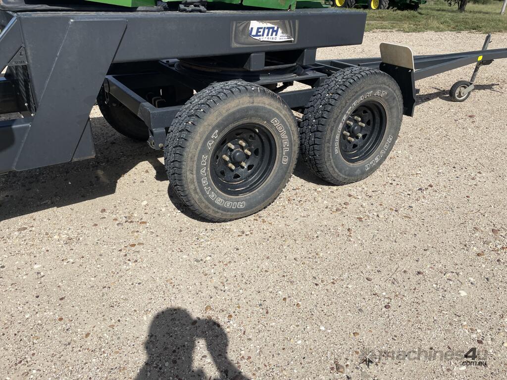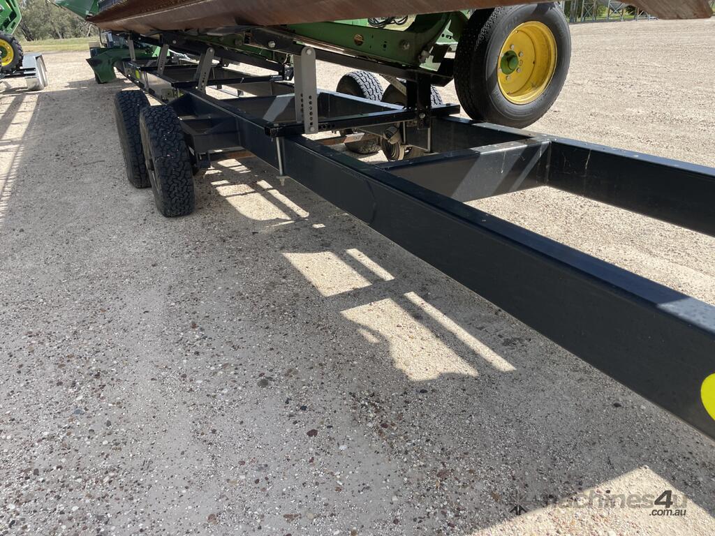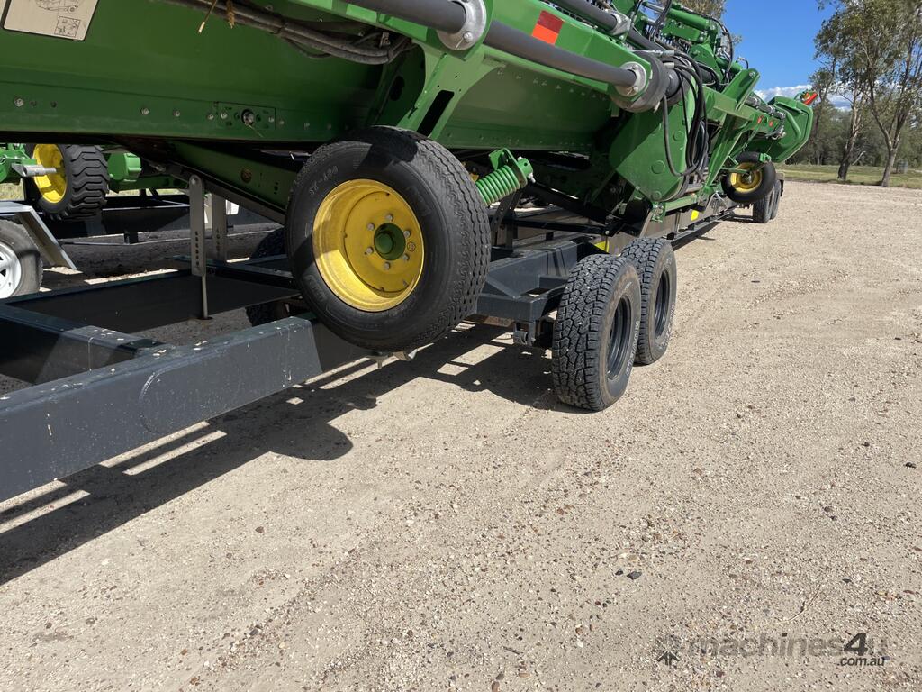 2023 John Deere 740D draper front with a 40-foot working width. Fitted with a gauge wheel tyre system for improved ground following. Comes with a Leith Engineering trailer for transport. Presents in like new, good working order.