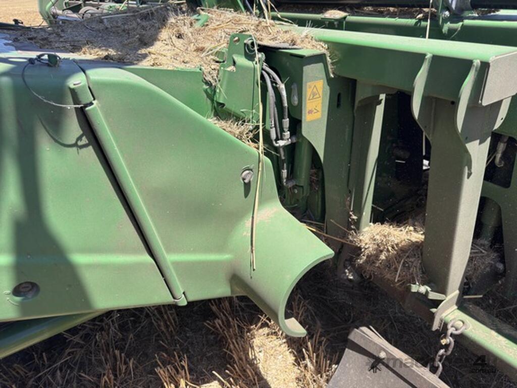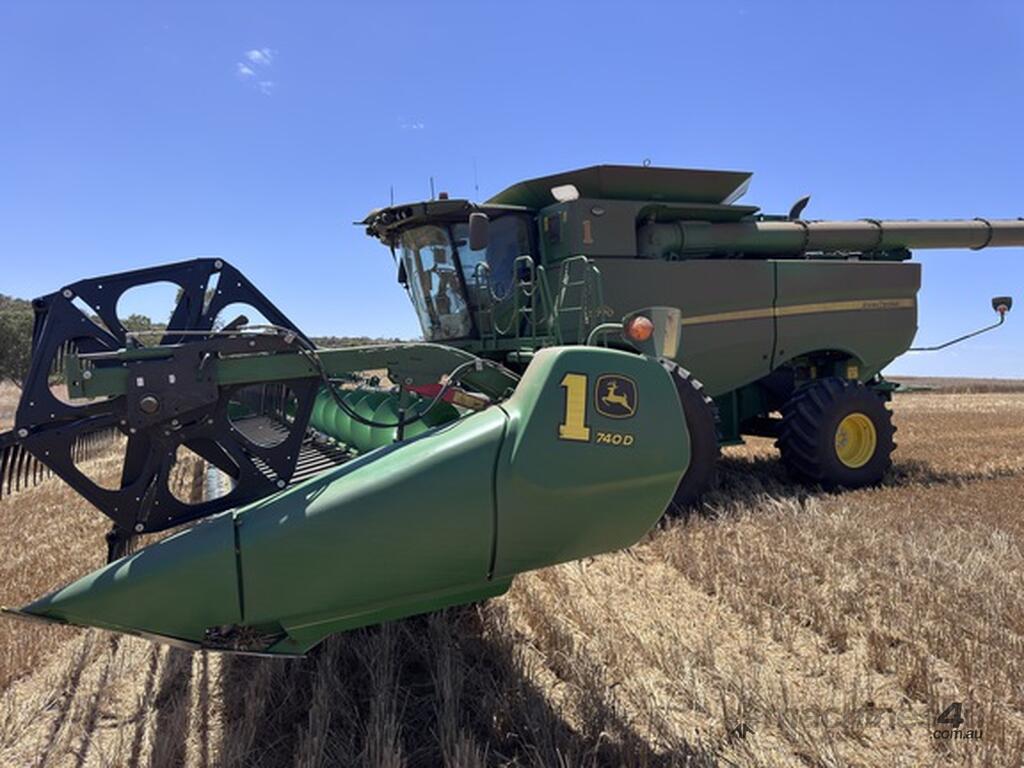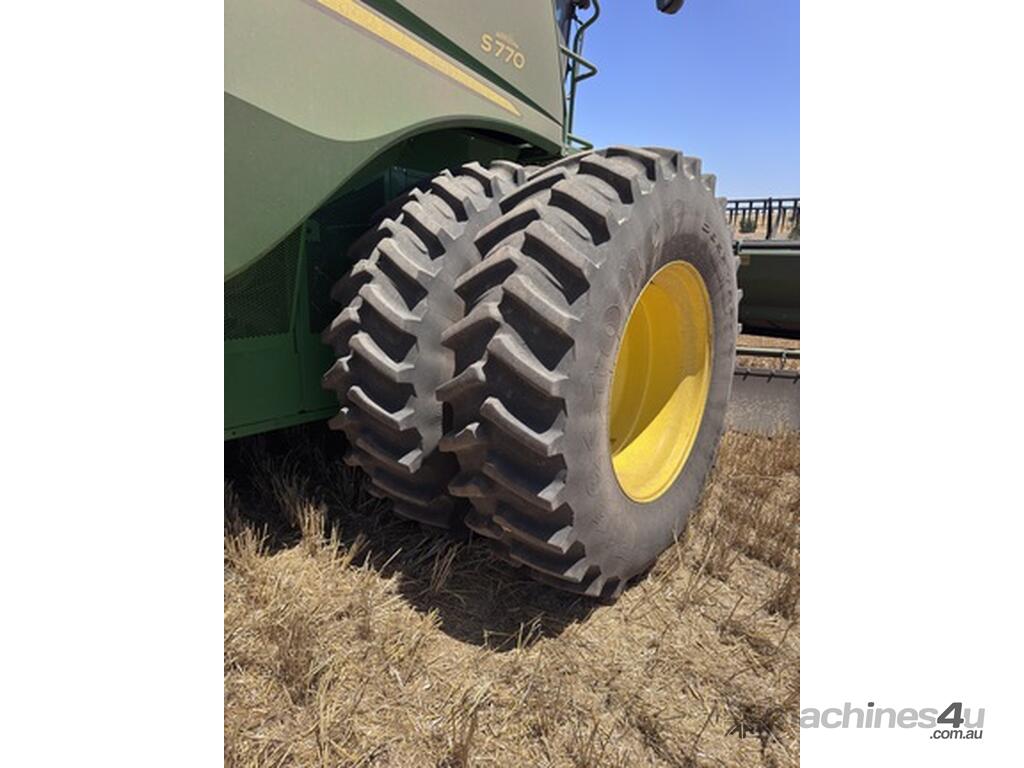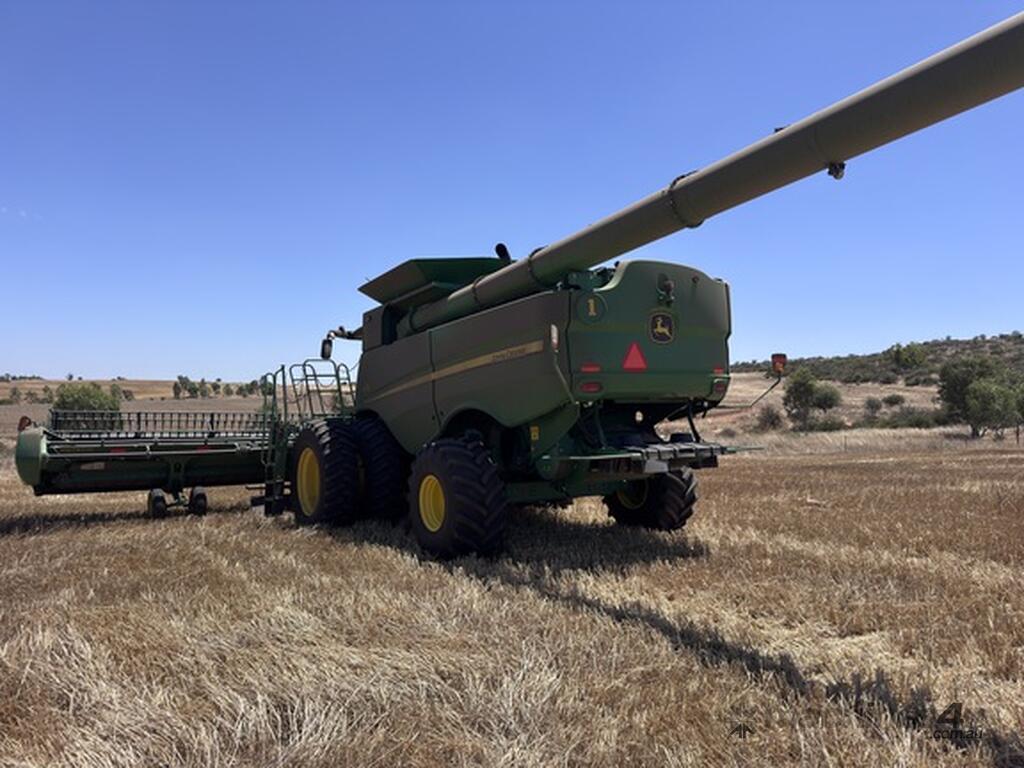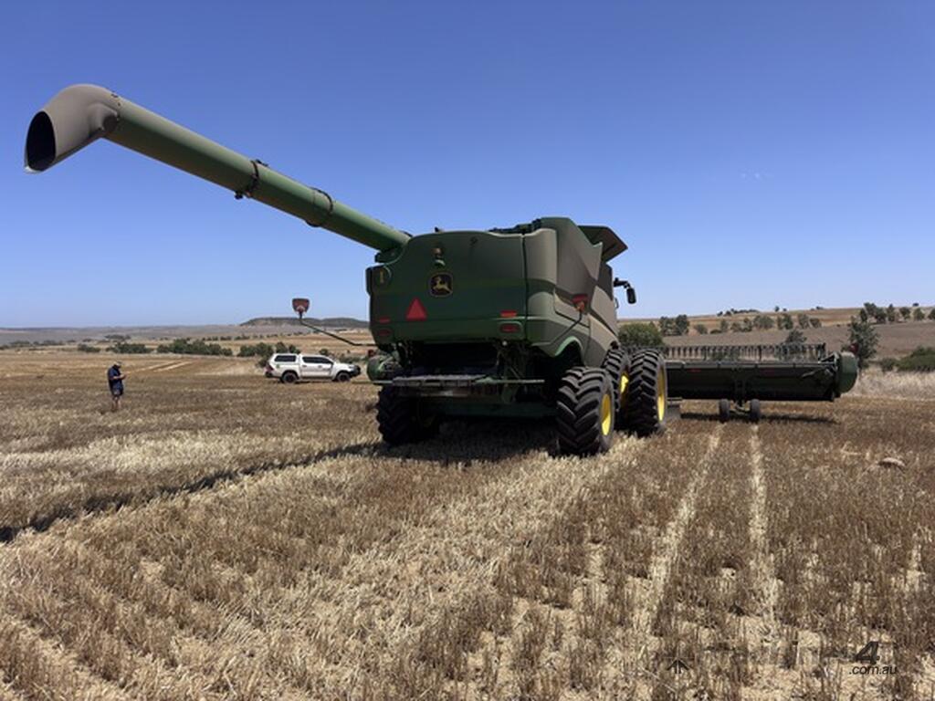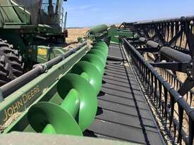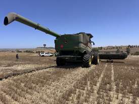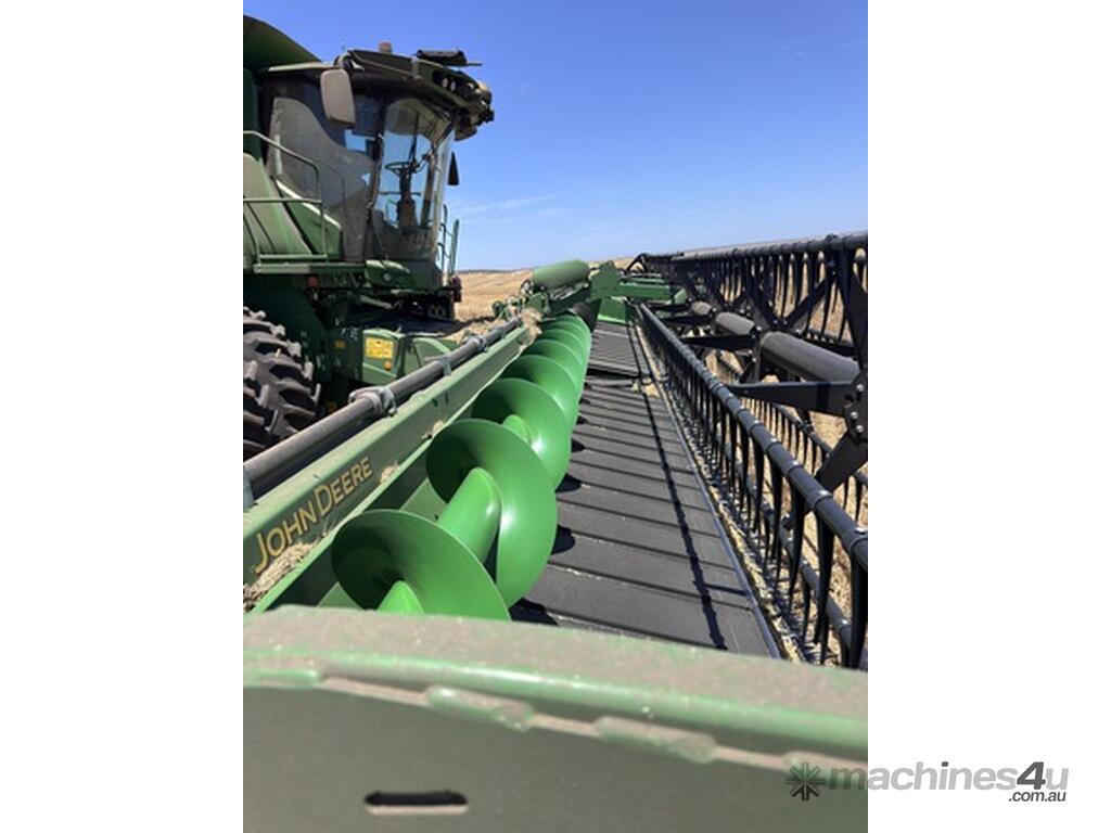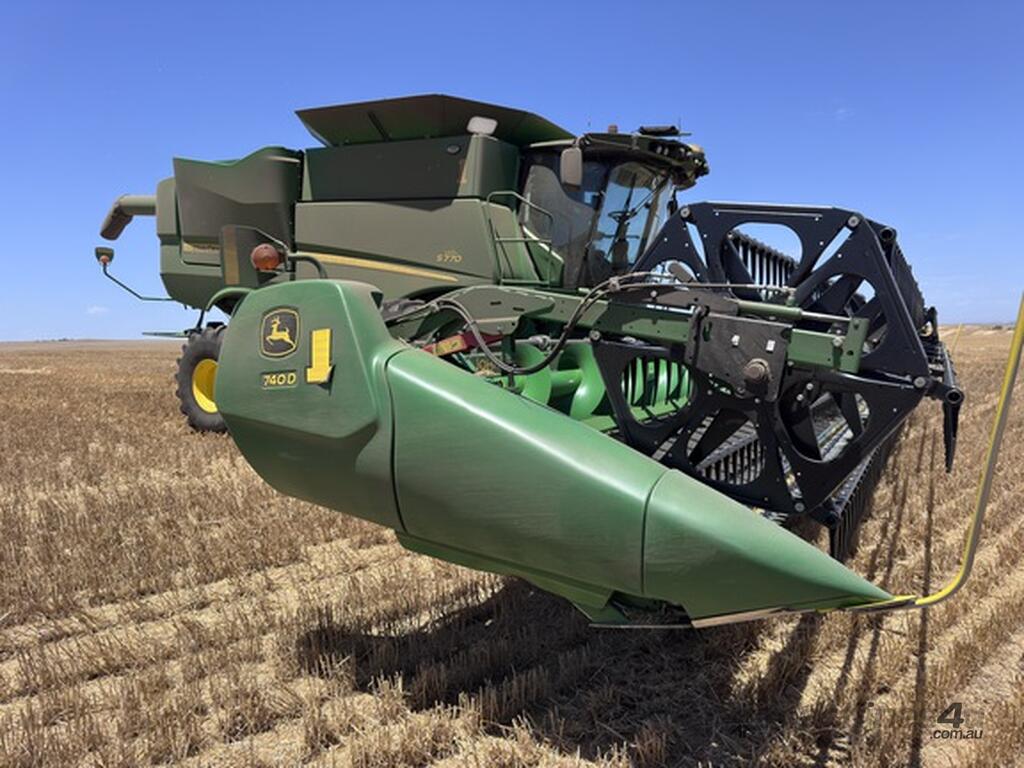 John Deere S770 duals chopper prodrive etc with John Deere 740D platform with top auger on trailer