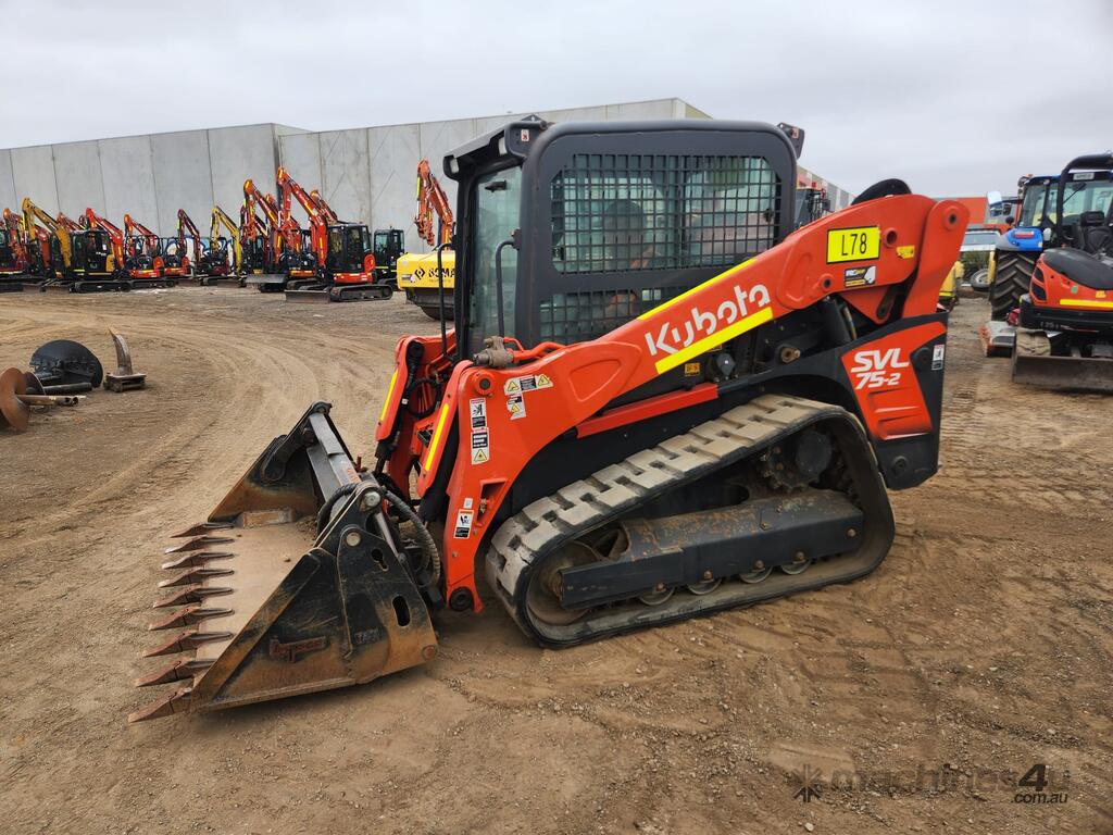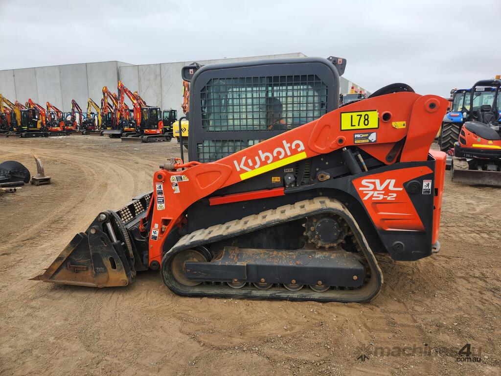 2023 KUBOTA SVL75-2 TRACKED LOADER (L78) IN EXCELLENT CONDITION WITH LOW 943 HOURS, WIDE SERIES RUBBER TRACKS, ROPS A/C CABIN, 4 IN 1 BUCKET, HYDRAULIC QUICK HITCH, UHF RADIO, E-STOPS, FULL CIVIL SPEC, 75 HP POWERFUL KUBOTA DIESEL ENGINE, VERTICAL LIFT LOADER ARMS, PILOT CONTROLS (ISO STANDARD), 2 TRAVEL SPEED, FULL WORK LIGHTS, HIGH BACK SUSPENSION SEAT, LOW MAINTENANCE UNDERCARRIAGE, AUXILIARY ELECTRICS. FULL HISTORY, READY FOR WORK. 3-MONTH DRIVETRAIN WARRANTY APPLIES.