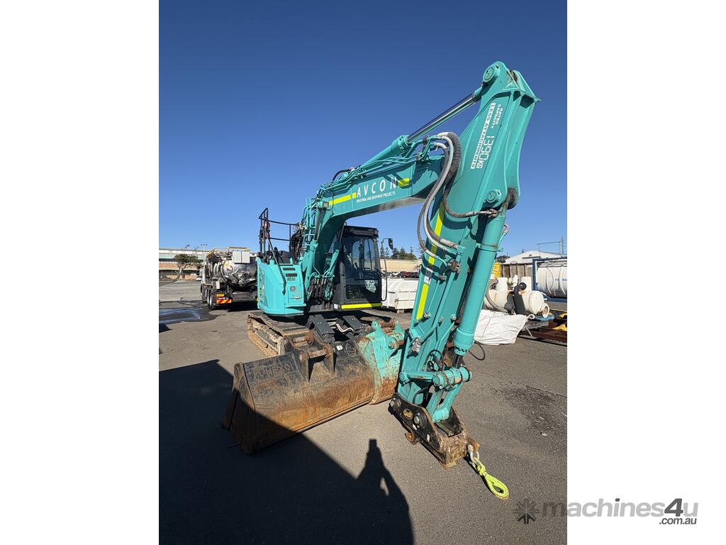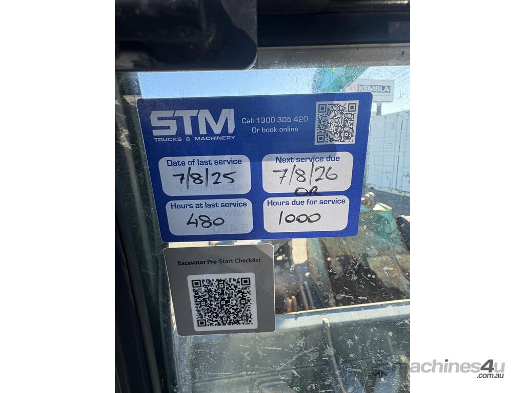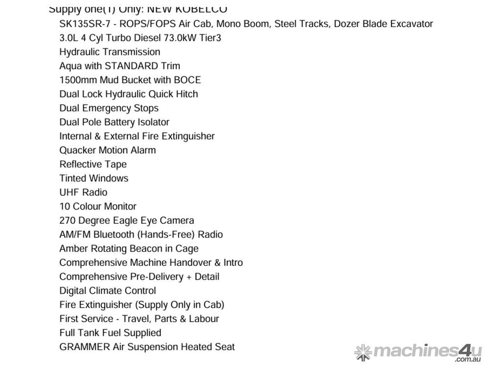 480 hours only! 2023 model, Kobelco SK135SR-7 surplus to requirements. Powered by a 3.0L 4-cylinder turbo diesel Tier 3 engine (73.0kW) with hydraulic transmission, it comes fully equipped with ROPS/FOPS air cab, mono boom, steel tracks, dozer blade, 1500mm mud bucket with BOCE, dual lock hydraulic quick hitch, hammer/auger/tilt piping, hose burst valves, safety hand rails, and ABS hydraulic grab.