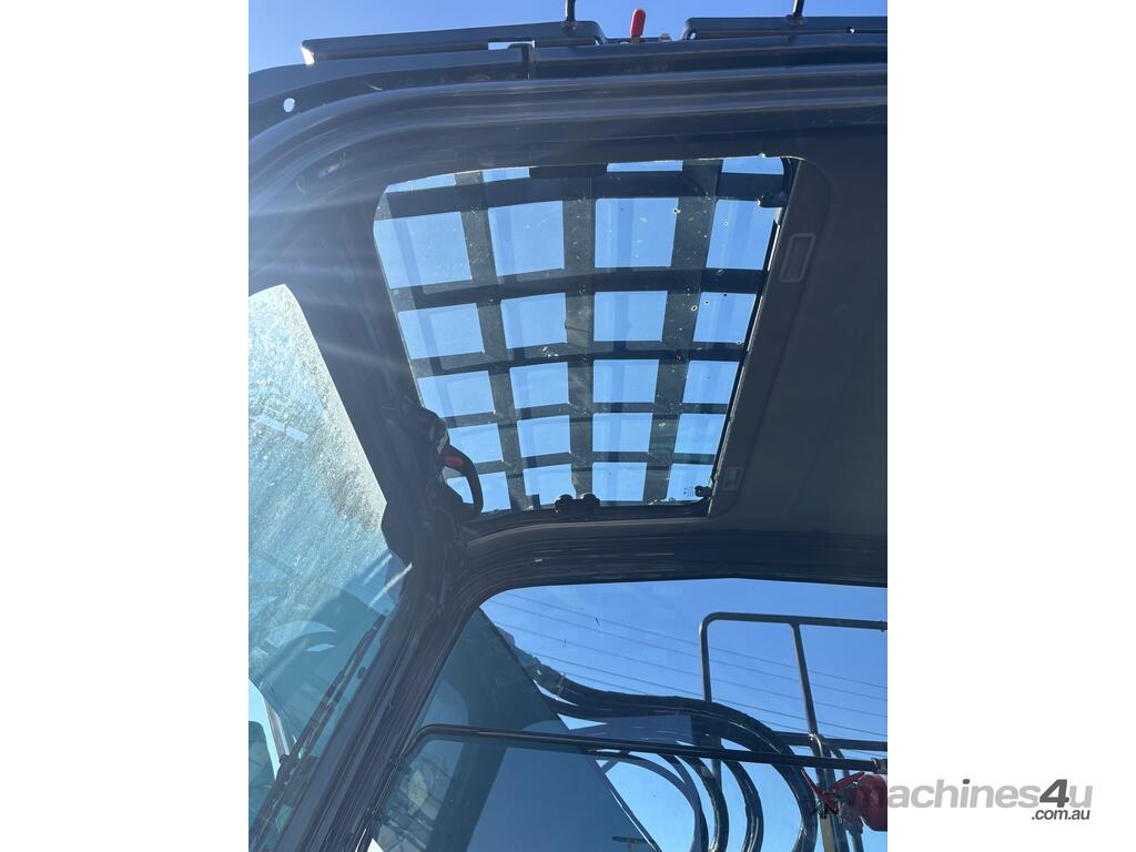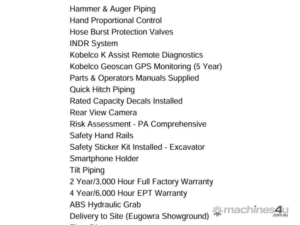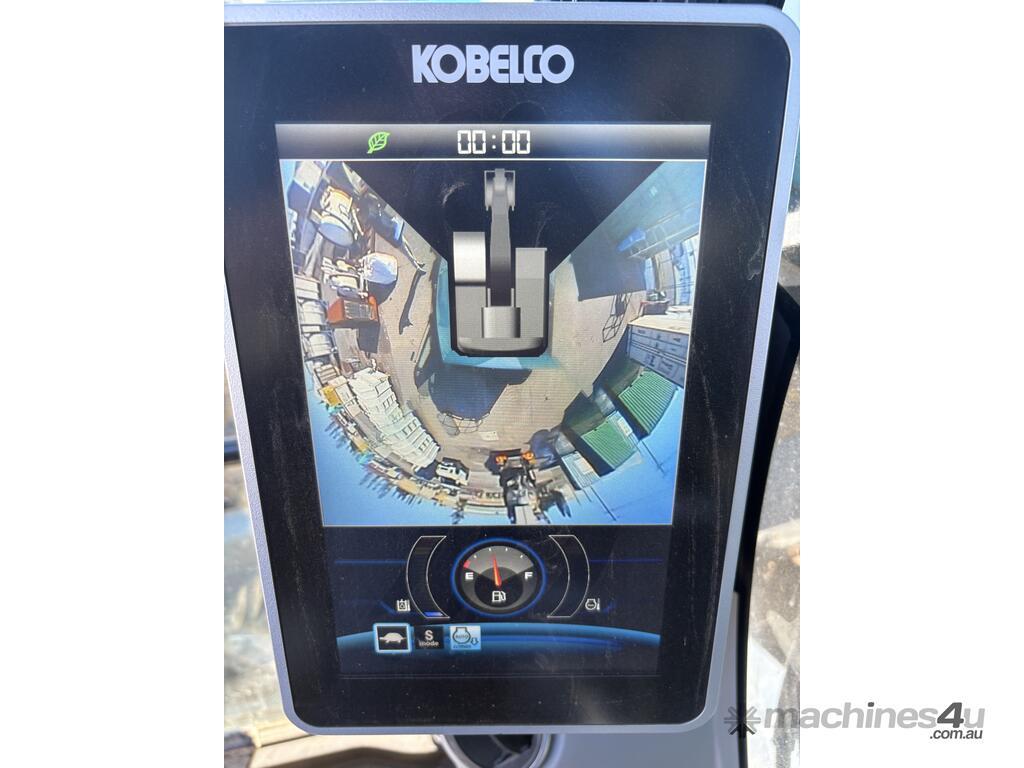 Includes Kobelco K Assist remote diagnostics, Geoscan GPS monitoring, INDR system, rear-view and 270° Eagle Eye cameras, UHF radio, AM/FM Bluetooth, digital climate control, GRAMMER heated air suspension seat, and full factory safety kit.