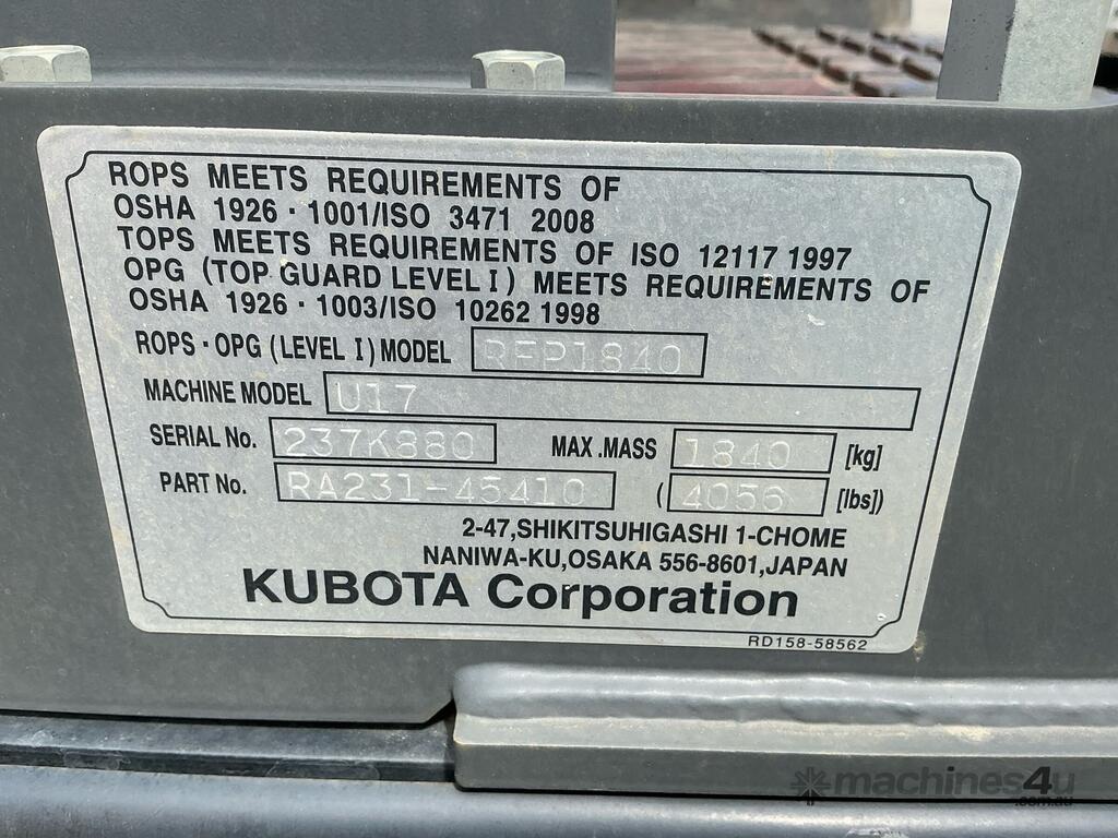 CP: CIRCA 2023,Kubota,U17-3,Excavator & Trailer,Engine #: 4PN8164,Diesel,Odometer not visible,214 (Hrs. Showing on Hour meter),Unregistered,Serial No: KBCAZ24CLP3G59671,Sold with No Plates