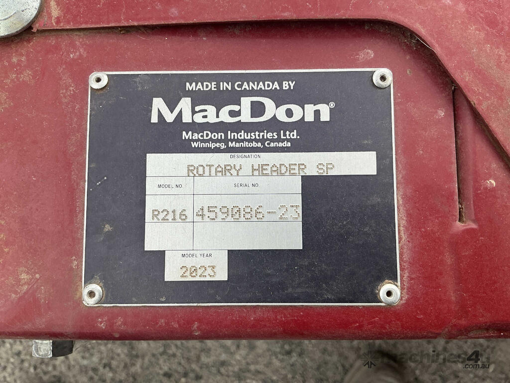 CP: CIRCA 2023,MacDon,R216 SP,Header,Odometer not visible,Hourmeter not visible,Colour: Red,Unregistered,Serial No: 45908623,Sold with No Plates,WOVR Status: WOVR N/A,Incident Type: Impact