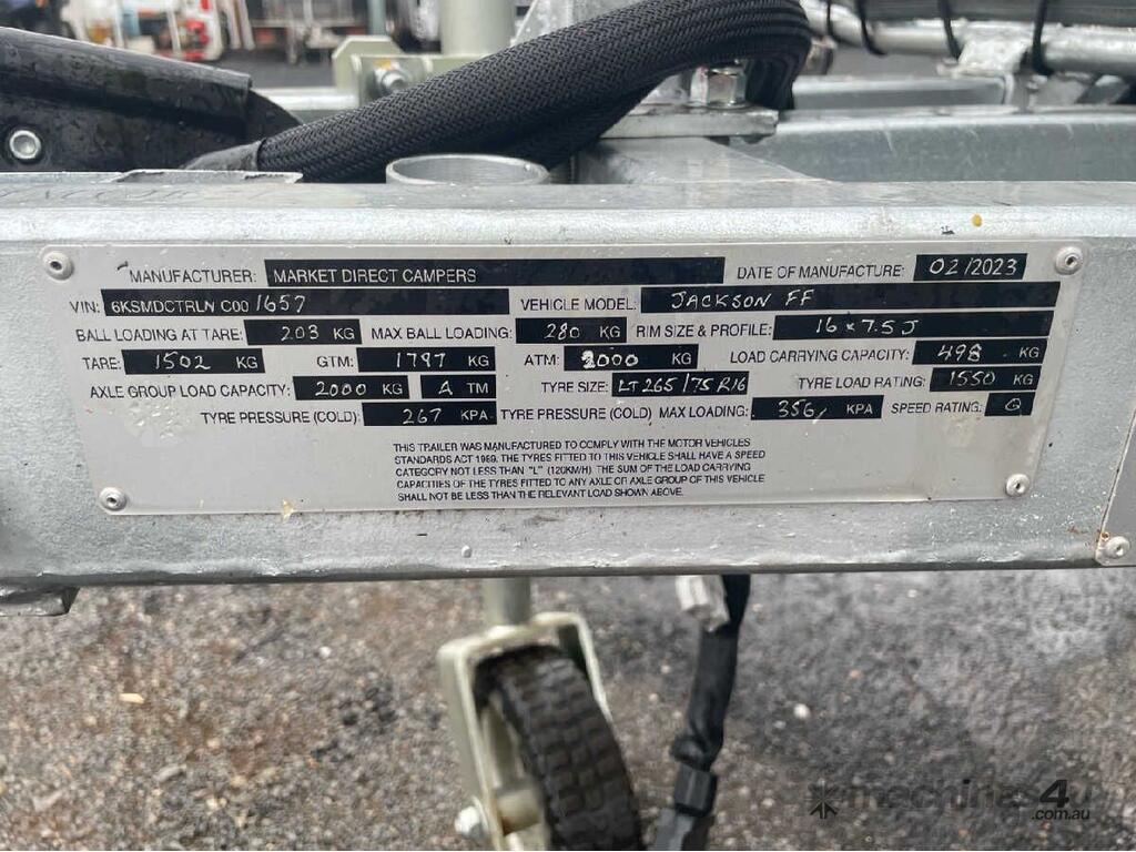 CP: 02/2023,Market Direct Campers,Jackson Forward Fold,Single Axle Camper Trailer,Hubometer not visible,Colour: Black,Rego. No: NP(TS00XZ), Unregistered,VIN: 6KSMDCTRLNC001657,Sold with No Plates