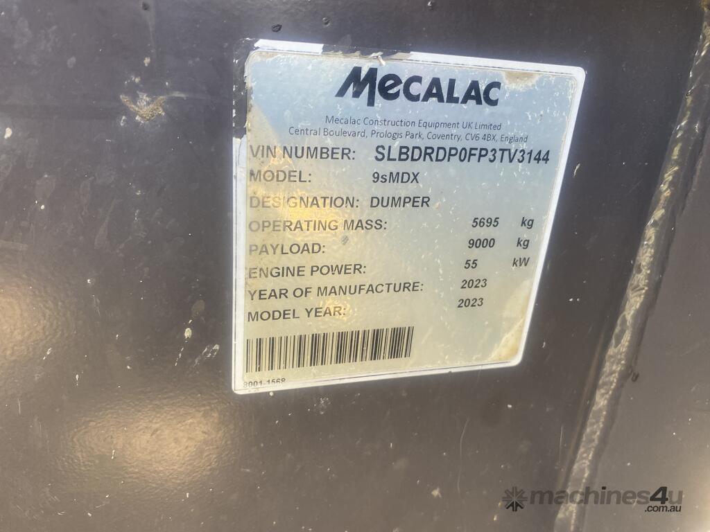 2023 Mecalac 9 ton site dumper. Machine has airconditioned cab, swivel body and normal civil spec requirements including emergency stops, dual pole battery isolator and UHF radio. One owner machine from new with service records available. Low 900hours and priced at only $98,000.00 + GST = $107,800.00 including GST. Machine located at Hexham NSW.