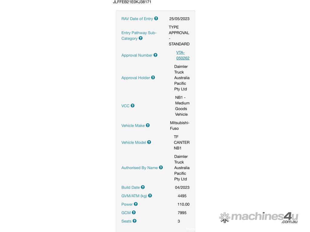 CP: 05/2023,Mitsubishi,Canter 515,Cab Chassis,Automatic,Leaf,4 Cyl,Diesel Turbo,61617 (Kms. Showing on Odometer),Hourmeter not visible,Colour: White,Unregistered WA,VIN: JLFFEB21E0KJ38171,Key No: 574,GVM: 4495,GCM: 7995,Sold with No Plates,WOVR Status: WOVR N/A,Incident Type: Impact,Key No: 574