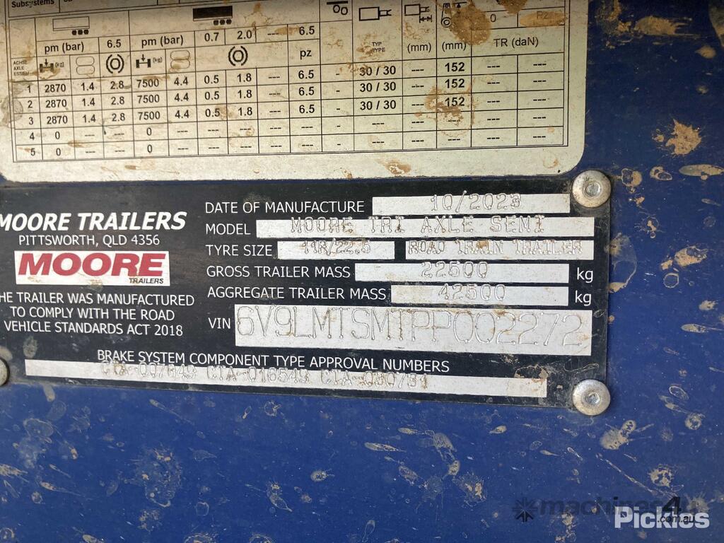 CP: 10/2023,Moore,Tri Axle Semi,Tri Axle Tipping Trailer,Hubometer not visible,Colour: Blue,Rego. No: NP(YQ63ZS), Unregistered QLD,VIN: 6V9LMTSMTPP002272,Sold with No Plates,WOVR Status: Repairable Write-Off,Incident Type: Impact