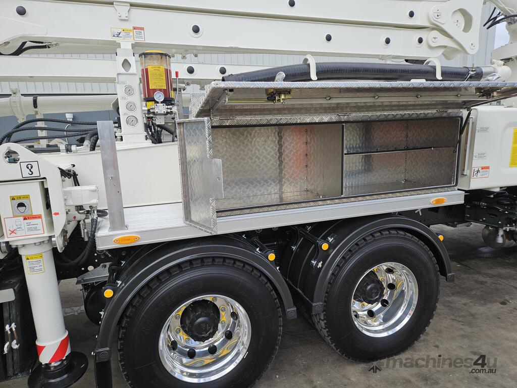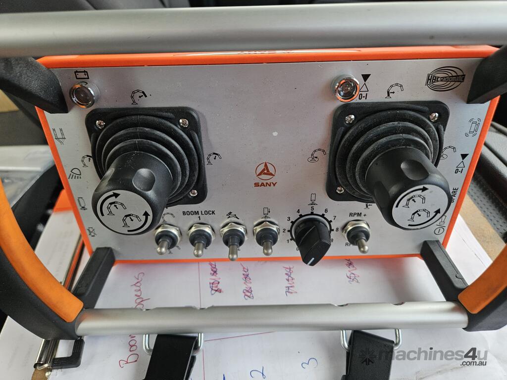 The Sany SY30 Z4-150 is a 4 stage Z fold boom, includes twin wall pipe, hard metal wear parts, vibrator, air tank blow out system, HP water blaster etc. The concrete Pump is 137 meter per hour, 230mm x 1600mm concrete cylinders, 70 bar concrete pressure, HBC radio remote system.