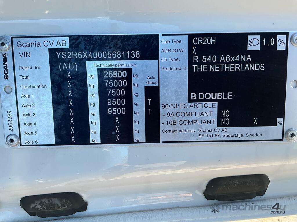CP: 04/2023,Scania,R540,Prime Mover,Automatic,Airbag,8 Cyl,Diesel Turbo,528106 (Kms. Showing on Odometer),7766 (Hrs. Showing on Hour meter),Colour: White,Rego. No: NP(XS66HD), Unregistered NAT,VIN: YS2R6X8,Length: 7 m,GVM: 25900,GCM: 75000,Sold with No Plates
