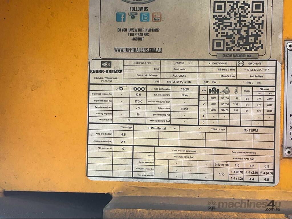 CP: 03/2023,Tuff Trailers,Tri Axle Semi OD,Tri Axle Drop Deck Widener,19095 (Kms. Showing on Hubometer),Colour: Yellow,Rego. No: YB73GM VIC,Rego expiry: 29/04/2026,VIN: 6K9T25TUFPC104013,Serial No: 6K9T25TUFPC104013,Sold with No Plates