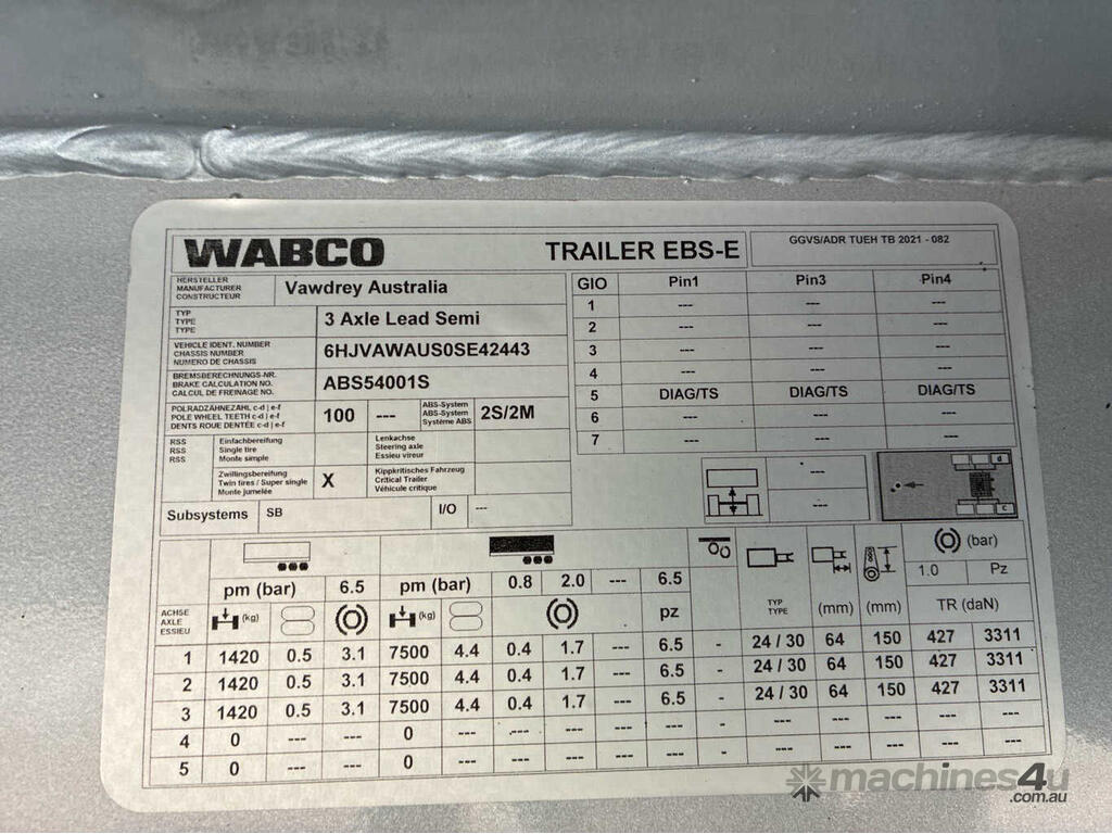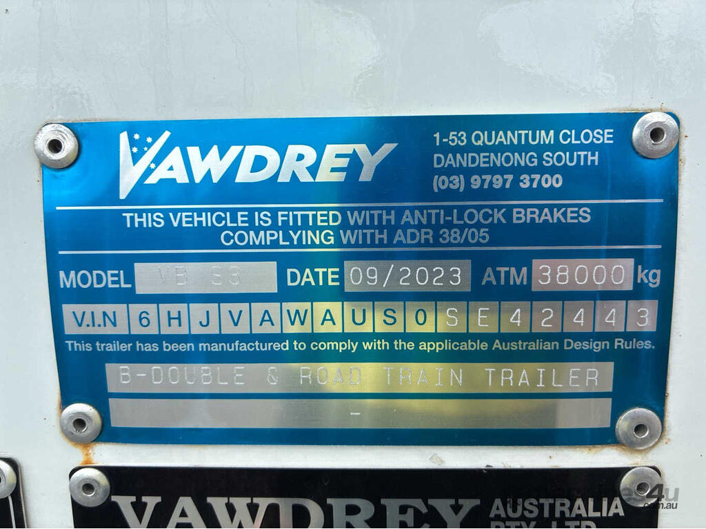 CP: 09/2023,Vawdrey,VB S3,Tri Axle Flat Top Curtainsider A Trailer,141182 (Kms. Showing on Hubometer),Colour: Silver,Unregistered,VIN: 6HJVAWAUS0SE42443,Sold with No Plates