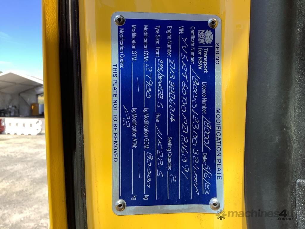CP: 02/2023,Volvo,FH13 Globetrotter,Prime Mover Sleeper Cab,Automatic,Airbag,Engine #: D,Volvo D13K540 EUVI (Euro 6),6 Cyl,Diesel Turbo,139910 (Kms. Showing on Odometer),1887 (Hrs. Showing on Hour meter),Colour: Yellow,Rego. No: NP(ELX020), Unregistered NSW,VIN: YV5RT60D0PD216091,Key No: 140,GVM: 27900,GCM: 80000,Sold with No Plates,Key No: 140