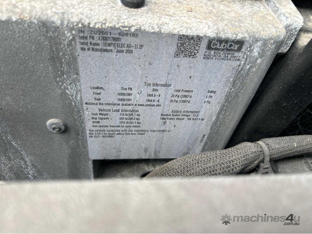 CP: 06/2024,Built: 06/2024,Club Car,Tempo,2 Seat Golf Cart,Battery,Odometer not visible,Hourmeter not visible,Colour: Green,Unregistered,Serial No: ZU,Sold with No Plates