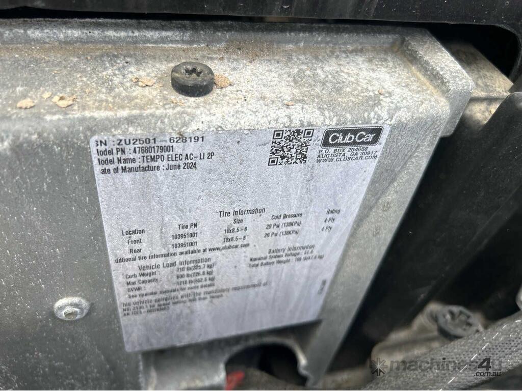 CP: 06/2024,Built: 06/2024,Club Car,Tempo,2 Seat Golf Cart,Battery,Odometer not visible,Hourmeter not visible,Colour: Green,Unregistered,Serial No: ZU,Sold with No Plates