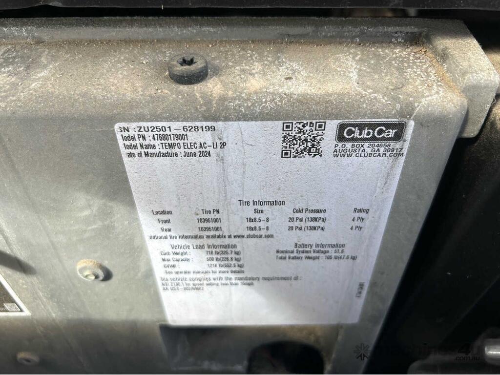 CP: 06/2024,Built: 06/2024,Club Car,Tempo,2 Seat Golf Cart,Battery,Odometer not visible,Hourmeter not visible,Colour: Green,Unregistered,Serial No: ZU,Sold with No Plates