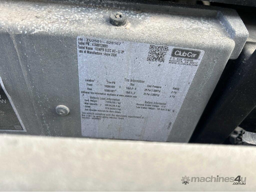 CP: 06/2024,Built: 06/2024,Club Car,Tempo,2 Seat Golf Cart,Battery,Odometer not visible,Hourmeter not visible,Colour: Green,Unregistered,Serial No: ZU,Sold with No Plates