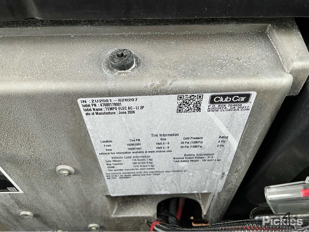 CP: 06/2024,Club Car,Tempo,Electric 2 Seat Golf Cart,Electric,Odometer not visible,Hourmeter not visible,Colour: Green,Unregistered,Serial No: ZU,Sold with No Plates