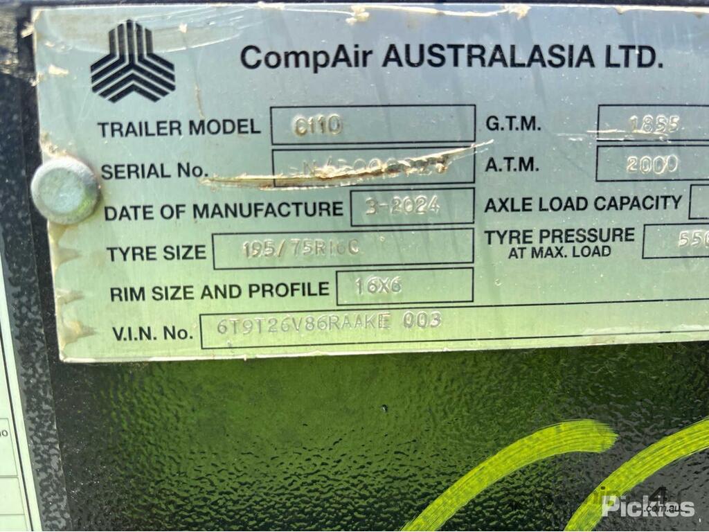 CP: 03/2024,Compair,C110,Air Compressor (Trailer Mounted),Hubometer not visible,Colour: Yellow,Rego. No: NP(75021B), Unregistered VIC,VIN: 6T9T26V86RAAKE003,Serial No: NULL,Sold with No Plates,WOVR Status: WOVR N/A,Incident Type: Impact