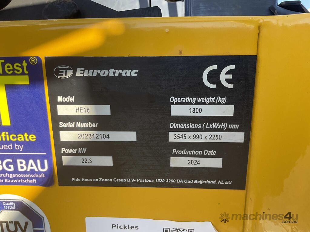 CP: CIRCA 2024,Eurotrac,HE18,Excavator (Rubber Tracked),Engine #: 4PK0539,3 Cyl,Diesel,Odometer not visible,138 (Hrs. Showing on Hour meter),Colour: Yellow,Unregistered,Serial No: ,Sold with No Plates,Key No: 387E