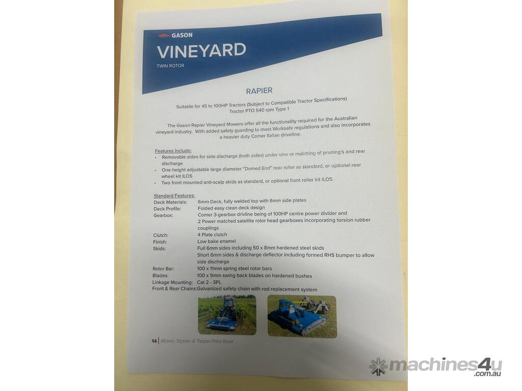 Gason Rapier Vineyard Mower models have been used extensively in many leading vineyards across Australia, the United States, France and New Zealand. Built tough, these machines have achieved an enviable reputation for giving years of reliable service.