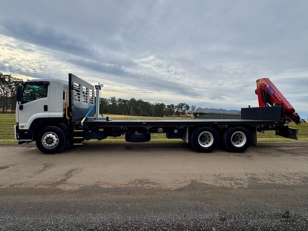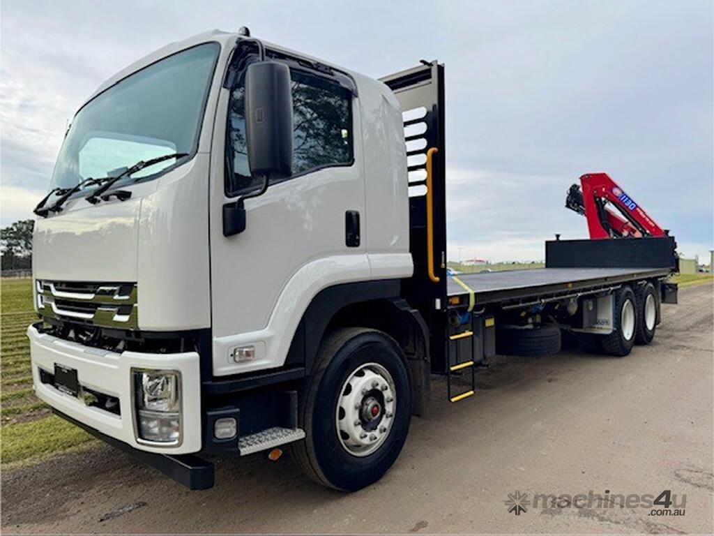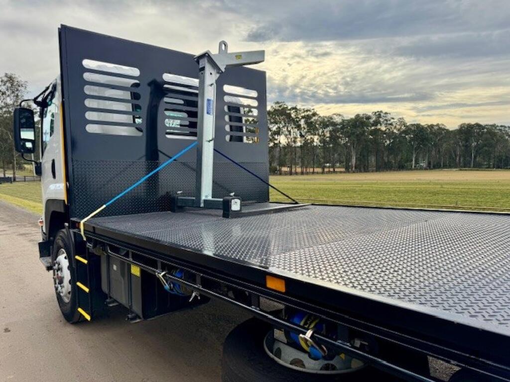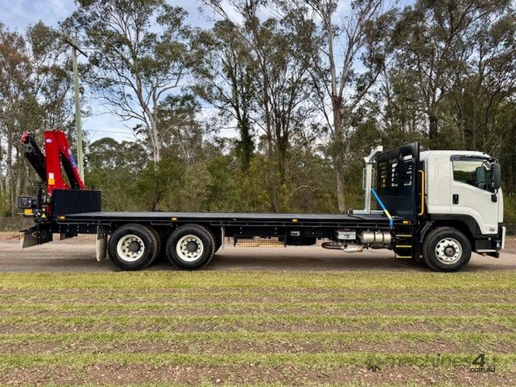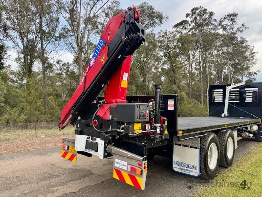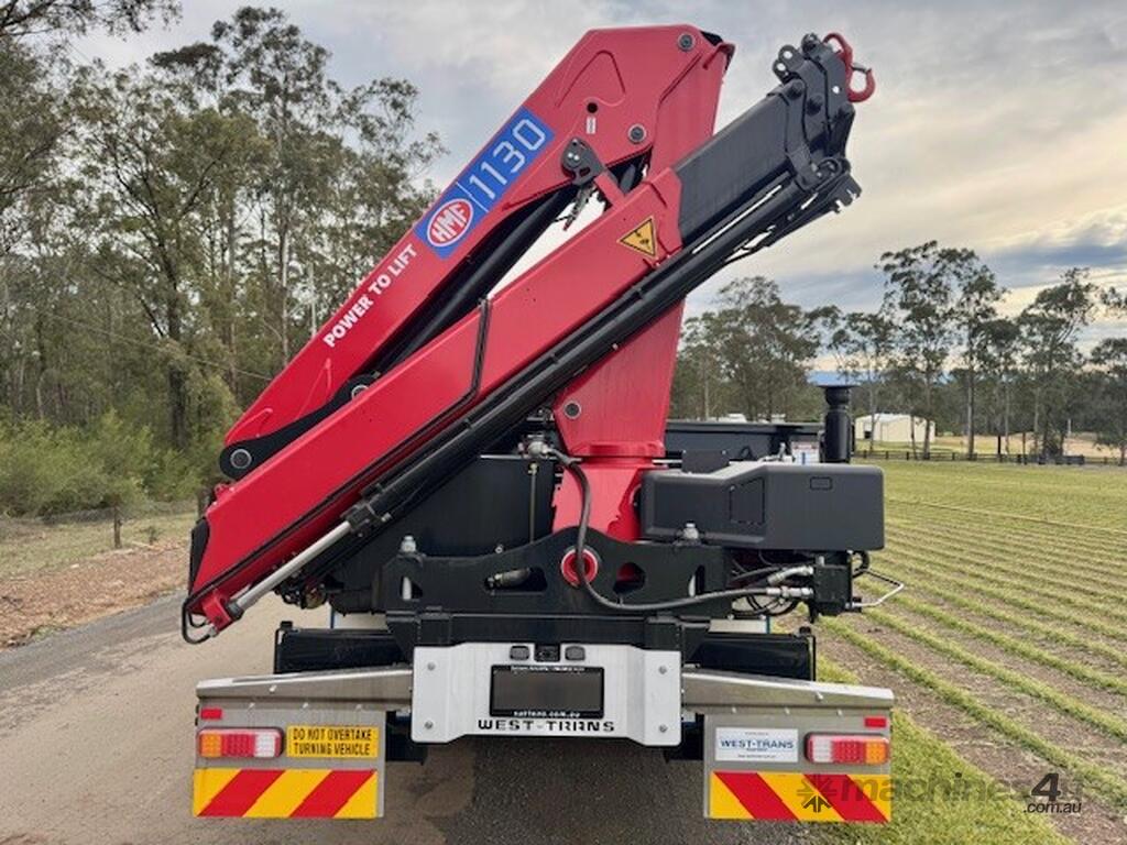 08/2024 Isuzu FVY 240-300 auto LWB, new 8m West-Trans-HMF tray and crane package, HMF 1130-K3 remote controlled crane rated at 9.9TM, tray is fitted with slide-on ratchet strap winches and toolbox, full setup is basically brand new with only 1750kms, warranty till mid-2031, registered until May 2026, comes with 2T rated self levelling pallet hook, selling for $325,000+GST