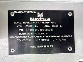 CP: 02/2024,Maxitrans,ST3,Tri Axle Flat Top Curtainside B Trailer,Hubometer not visible,Colour: Black,Rego. No: NP(YB34BE), Unregistered,VIN: 6F80000000B125258,Sold with No Plates