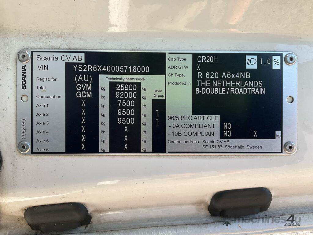 CP: 09/2024,Scania,R620,Prime Mover Sleeper Cab,Automatic,Airbags ,8 Cyl,Diesel Turbo,199649 (Kms. Showing on Odometer),2376 (Hrs. Showing on Hour meter),Colour: White,Rego. No: NP(XP50CD), Unregistered NSW,VIN: YS2R6X0,Key No: 365E,Length: 7.1 m,GVM: 25900,GCM: 92000,Sold with No Plates,Key No: 365E