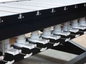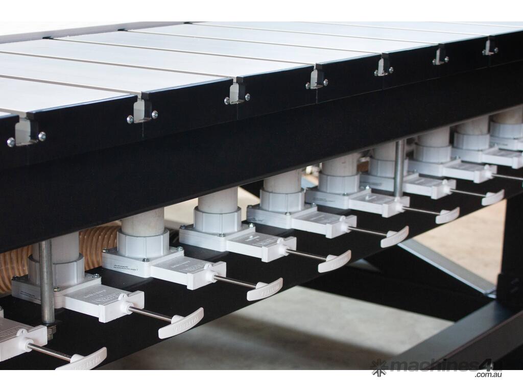 Material Hold-down: Matrix Vacuum Table Bed supported by 4x high-volume vacuum pumps, with reverse pump function for floating material on bed.