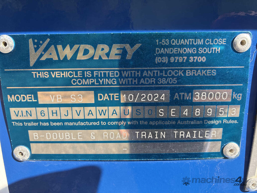 CP: 10/2024,Vawdrey,VB S3,Tri Axle Drop Deck Skel Trailer,4143 (Kms. Showing on Hubometer),Colour: Blue,Unregistered,VIN: 6HJVAWAUS0SE48953,Sold with No Plates
