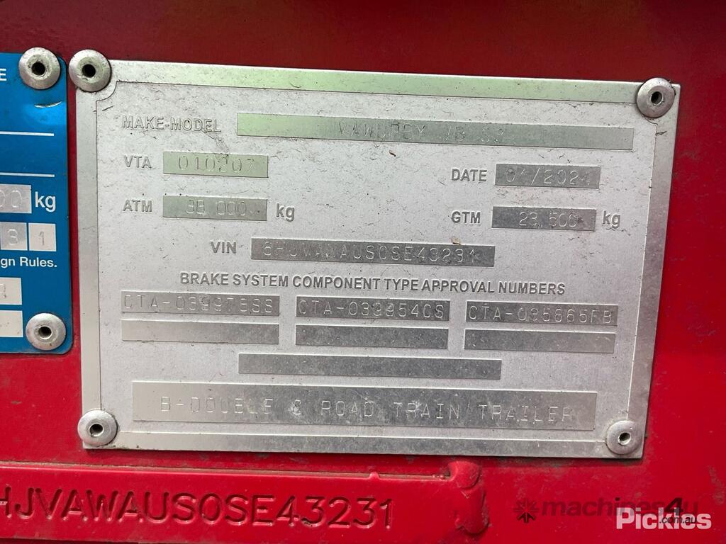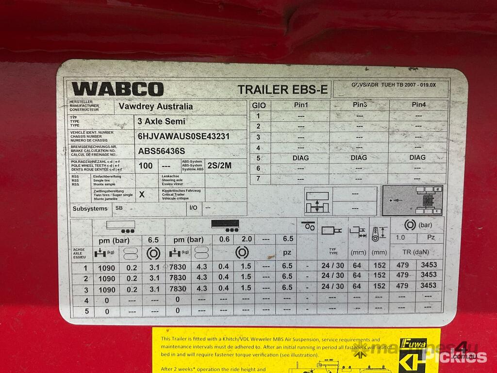 CP: 01/2024,Vawdrey,VBS3,Tri Axle Skel Trailer,43017 (Kms. Showing on Hubometer),Colour: Red,Unregistered,VIN: 6HJVAWAUS0SE43231,Sold with No Plates