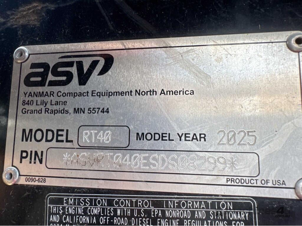 CP: CIRCA 2025,ASV,RT-40,Posi Track Loader,3 Cyl,Diesel,Odometer not visible,Hourmeter not visible,Colour: Yellow,Unregistered,VIN: ASVRT040ESDS08299,Sold with No Plates,WOVR Status: WOVR N/A,Incident Type: Water