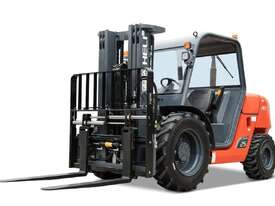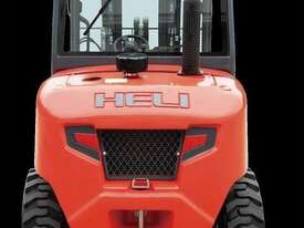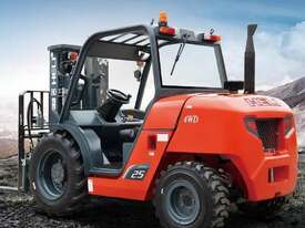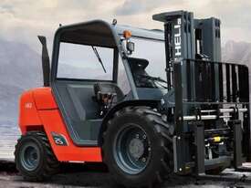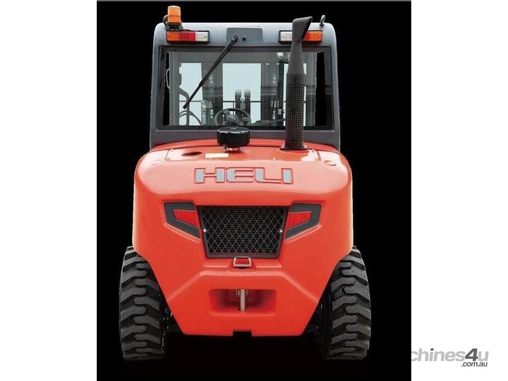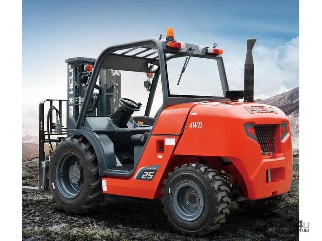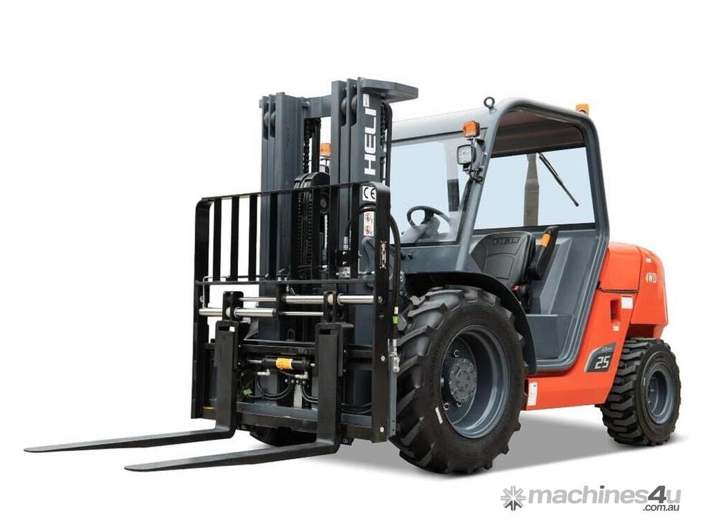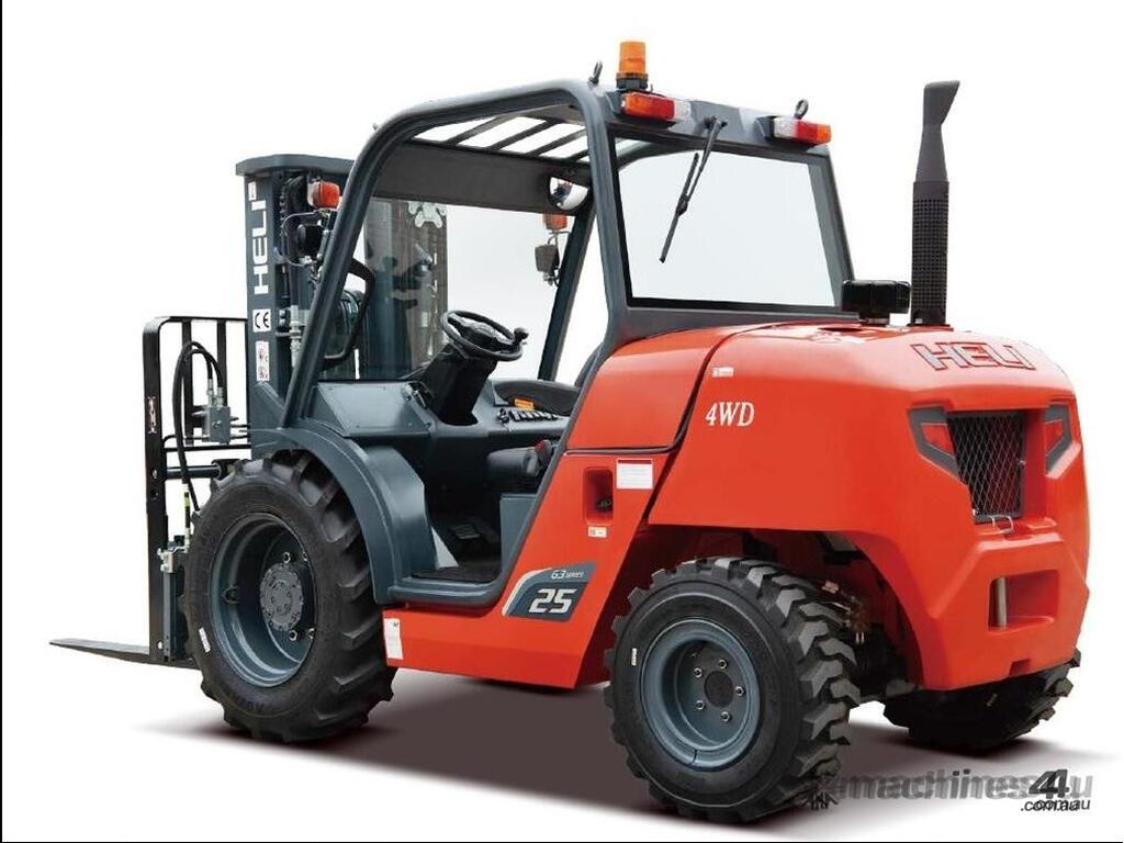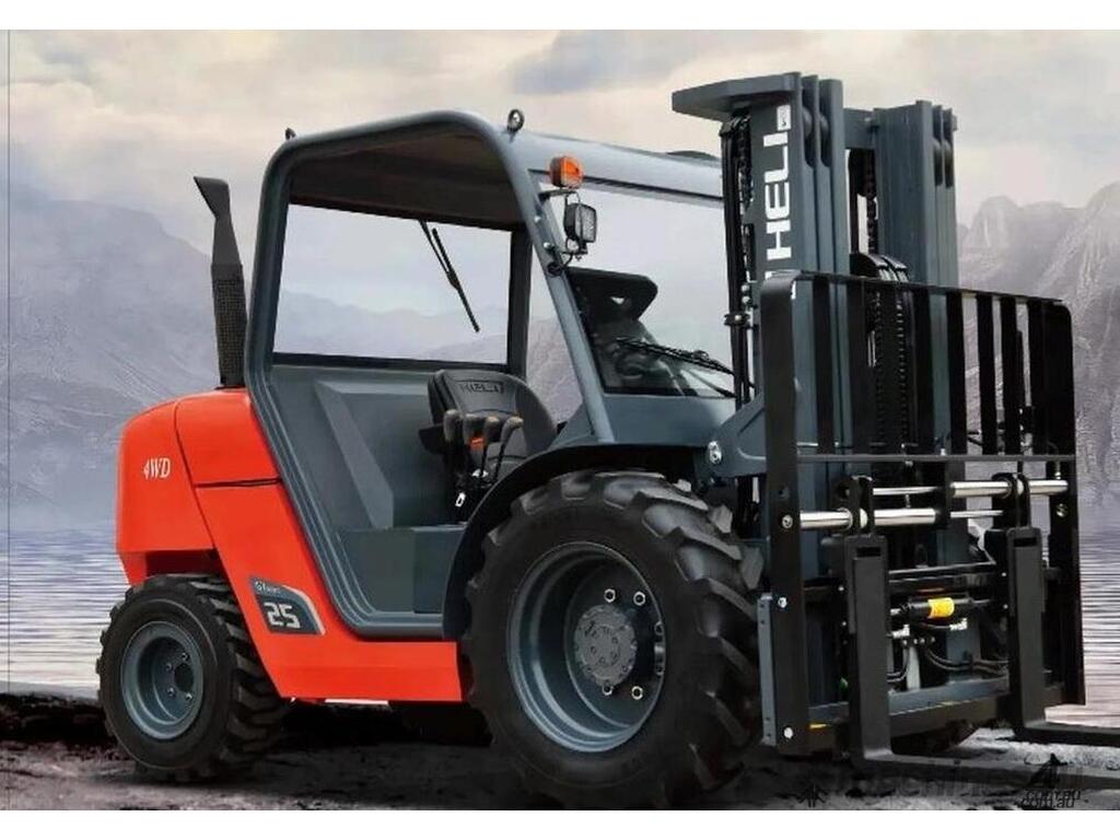 Brand-new HELI 2.5-ton compact rough-terrain forklift. Powered by a Kubota diesel engine with hydrostatic transmission for smooth, strong performance on uneven ground. Compact size, excellent turning radius, and fast lift speeds make it ideal for construction, farms, timber yards, and outdoor sites.