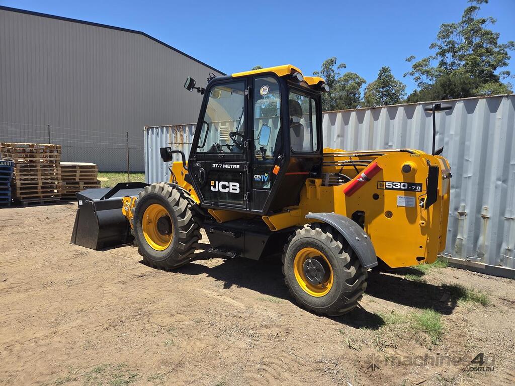 Near New Telehandler. 12hrs only. 3,170 kg lift capacity. 7m lift. 3.7m reach. 76hp. Operating weight approx. 7ton. Max speed 30kph. 4-speed powershift transmission, 4 wheel drive, JCB DieselMAX 448 engine 4.8L 4cyl. 5m L, 2.23m W, 2.5m H. Air-cond. Fork or Bucket option. Manual Coupler. Auxiliary Hydraulic Plumbing.