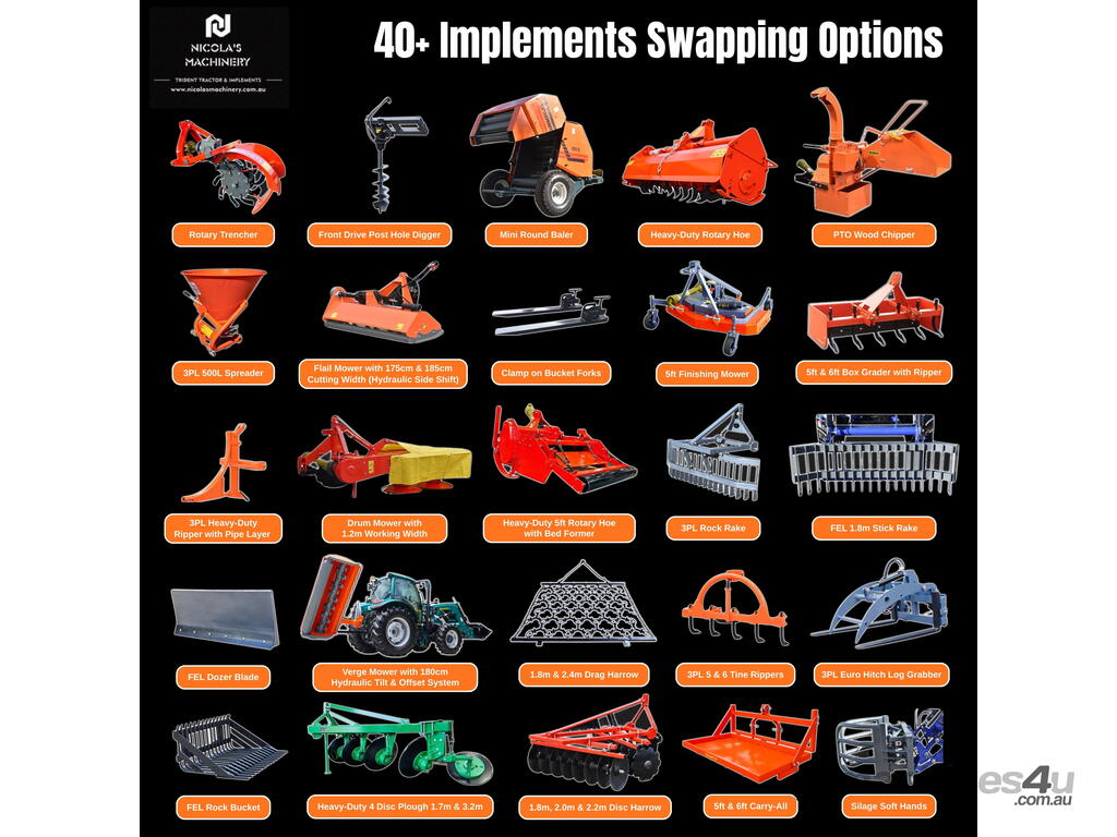 COMBO A: TRIDENT 45HP 4WD canopy tractor with FEL 4in1 bucket + 4FT slasher + post hole digger with 9 inch auger + combined forks (pallet + hay) for only $27,990 inc. GST