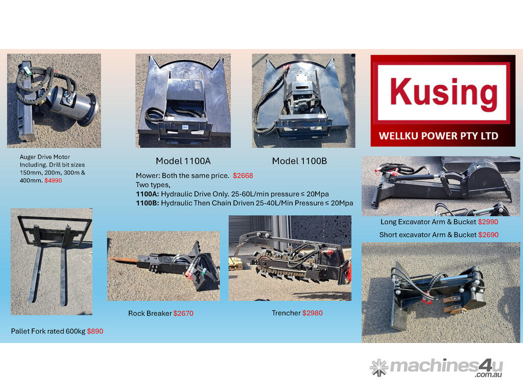 Optional attachments available : Forks / Excavation Arms / Hydraulic Auger / Rock Breaker / Brush Mower / Trencher / 4 in 1 Bucket / Grapple Bucket / Stump Grinder / Ground Leveler.