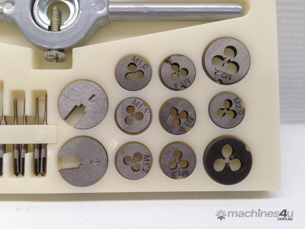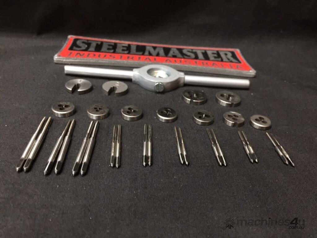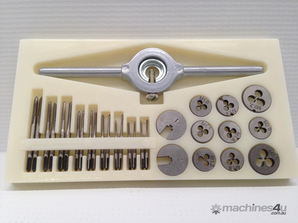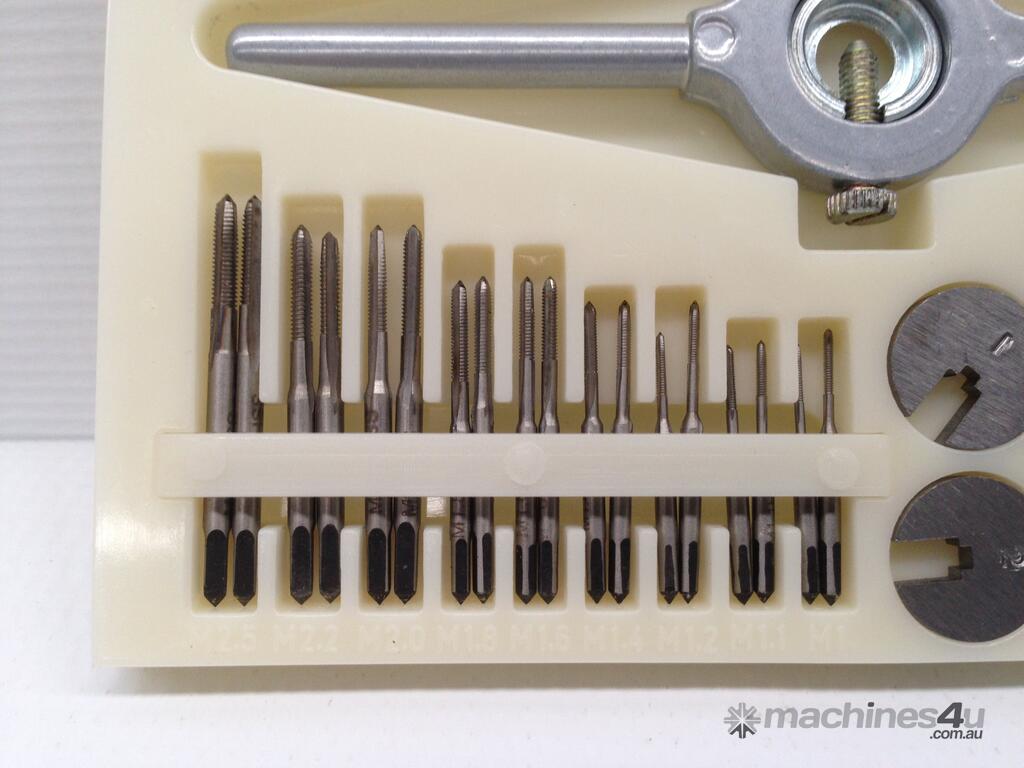 This miniture set includes fine threads numbered taps and dies from M1 -M2.5 tap and die, tap handle, die handle and steel case.