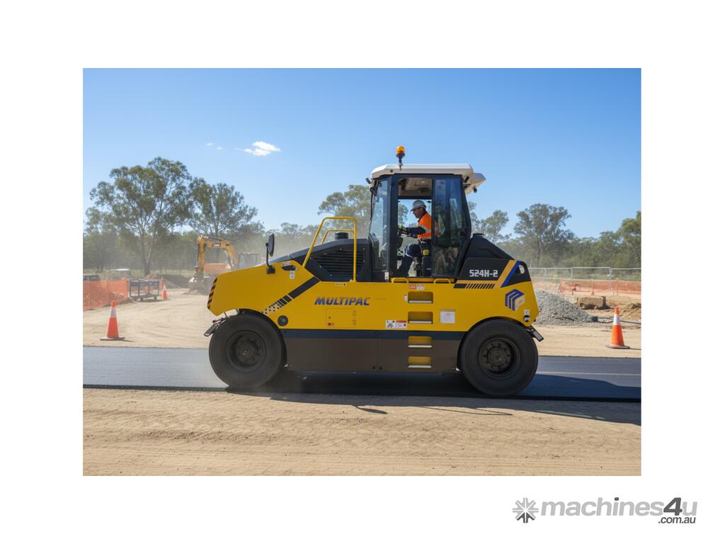 The Multipac H-Series Pneumatic Tyre Rollers offers an impressive operating range from 12 to 24 tonne, achieved with rapid removable factory steel ballast. The modern German Hydrostatic drive system allows for a sensitive and more responsive drive control. Unique 9 wheel setup (4 front - 5 rear) allowing optimum compaction and shouldering precision. The H-Series Pneumatic Tyre Roller boast superior operator comfort eliminating driver fatigue with ergonomic driver station and spacious cabin environment. The H Series Pneumatic Tyre rollers will Increase productivity and efficiency on road construction sites along with cost effectiveness.