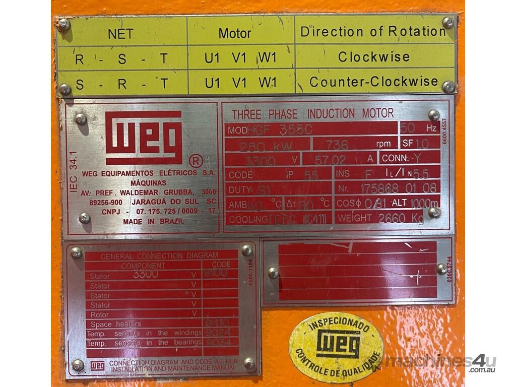 250 kw 330 hp 8-pole 736 rpm 3300v 3.3kv Foot Mount 355C frame AC Electric Motor WEG Model HGF 355C unused