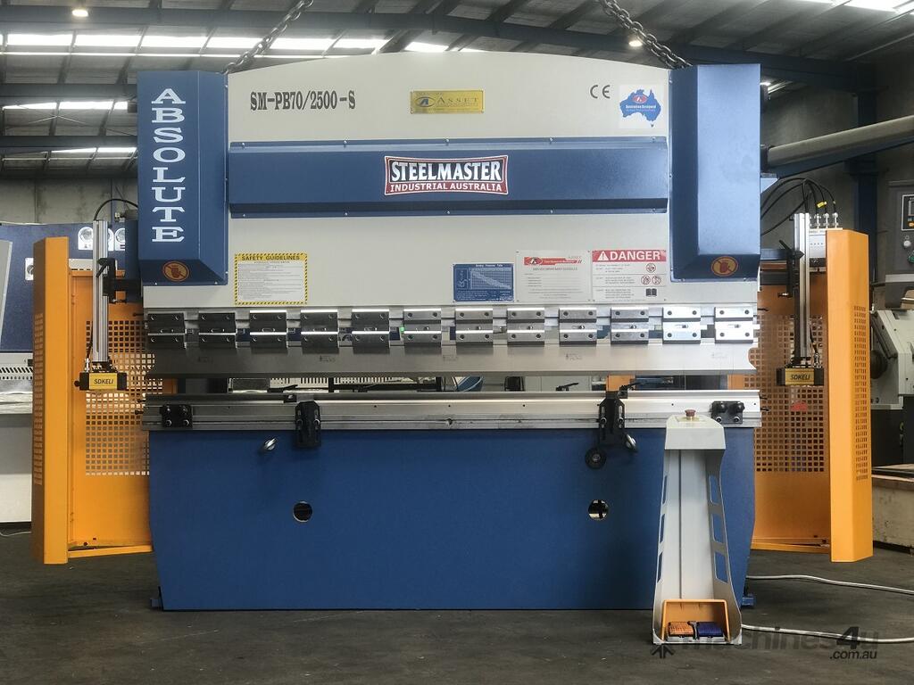SM-PB70/2500NC-S. ABSOLUTE. Hydraulic Pressbrake. 2500mm x 70Ton. 2 Axis NC Estun E21 Controller, Top & Bottom Tooling, 250mm Side Throat, 2100mm Between Frames, Leadscrew Backgauge with 4 Fingers