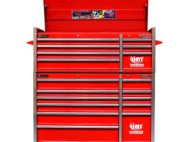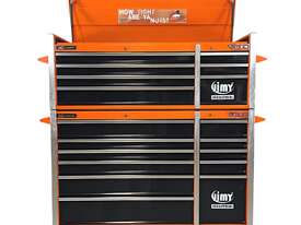 The 18 drawer “Introductory” tool kit from Jimy Tools offers a great range of tools for the tradesperson. The kit consists of a 7-drawer top box and an 11-drawer roller cabinet, all have been powder coated with a tough industrial finish, 1.0mm thick steel, fully lockable with rear internal locking system, dual gas strut system for lidandball bearing slide drawers with twin slides on the deeper drawers. Included are metric 4mm - 32mm and SAE 5/32” - 1-1/4” sockets and a full complement of 1/4”, 3/8” and 1/2” drive socket accessories including ratchets, breaker bars, extensions bars from 50mm up to 900mm long.