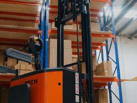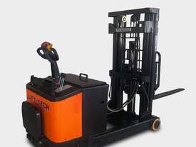 Compact electric stacker built for real warehouse use. Handles up to 1000 kg with a 3.5 m lift height, reinforced mast, and tight walk-behind manoeuvring. Includes 1 m of powered reach so you can push the load forward for racking, loading, or clearing truck decks without shuffling the whole machine.
