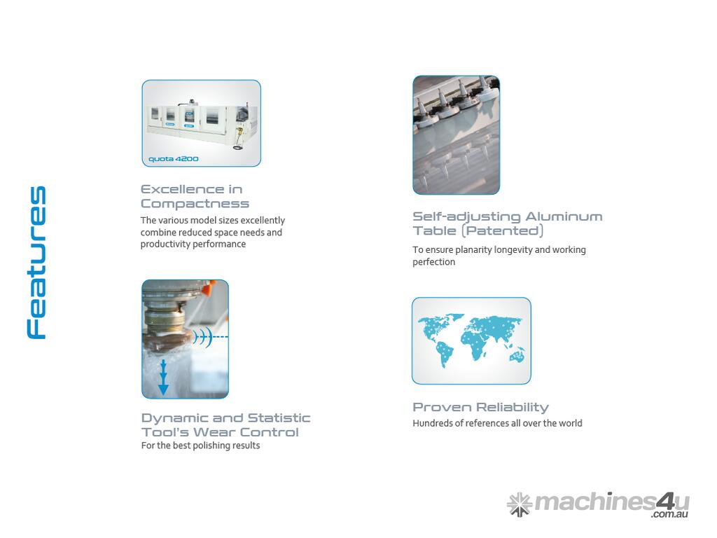 All axes motion is powered by brushless motors with accuracy ensured by prismatic steel guideways with 4 revolving balls pads protected by bellows. QUOTA Stone, thanks to its advanced ergonomics, features top class working area/machine footprint ratio allowing machining of mm. 3250 x 1550 sheets (with mm.100 tool diameter) in an extremely reduced space. The machine is driven by a CNC OSAI control unit with axes control digital technology and run by a worldwide renowned user-friendly 2D and 3D (Option) software interface.