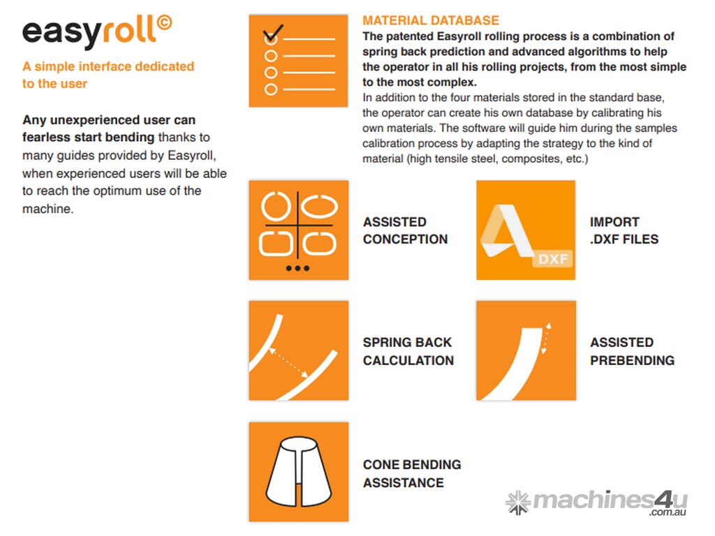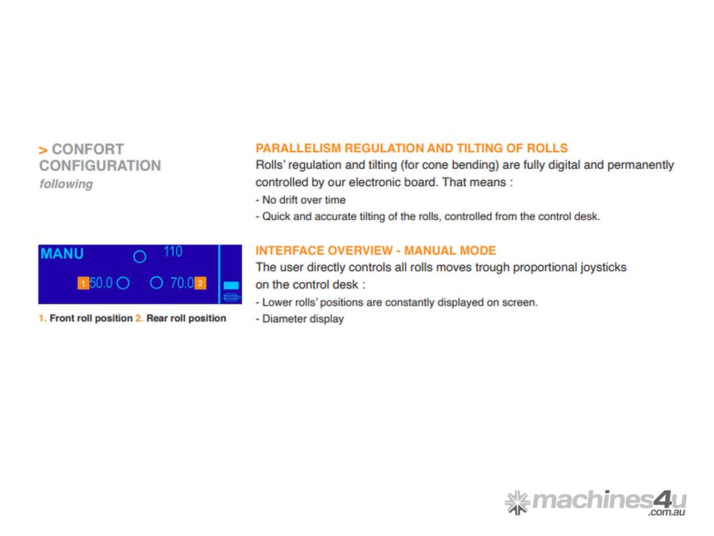 It is also the preferred machine for the training of operators in cfai-type schools and training centres. It almost completely replaces the sheet metal roller of asymmetrical technology 3 rollers. Indeed it allows, by its small footprint and its hydraulic power, to work all the materials (Steel, Stainless steel, aluminum) of small thickness (up to 3 to 4 mm) without damaging them and with great ease.