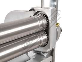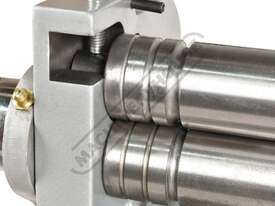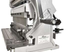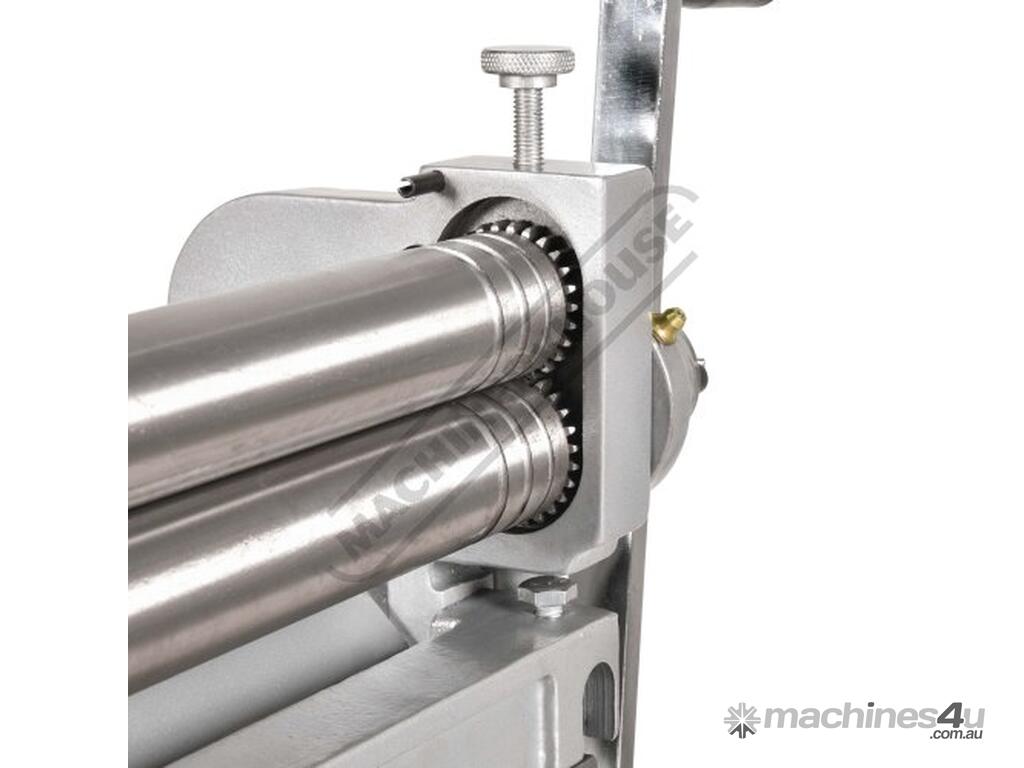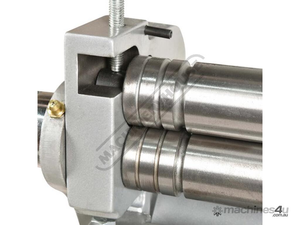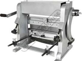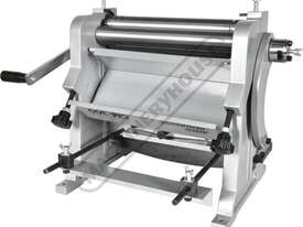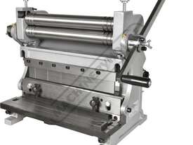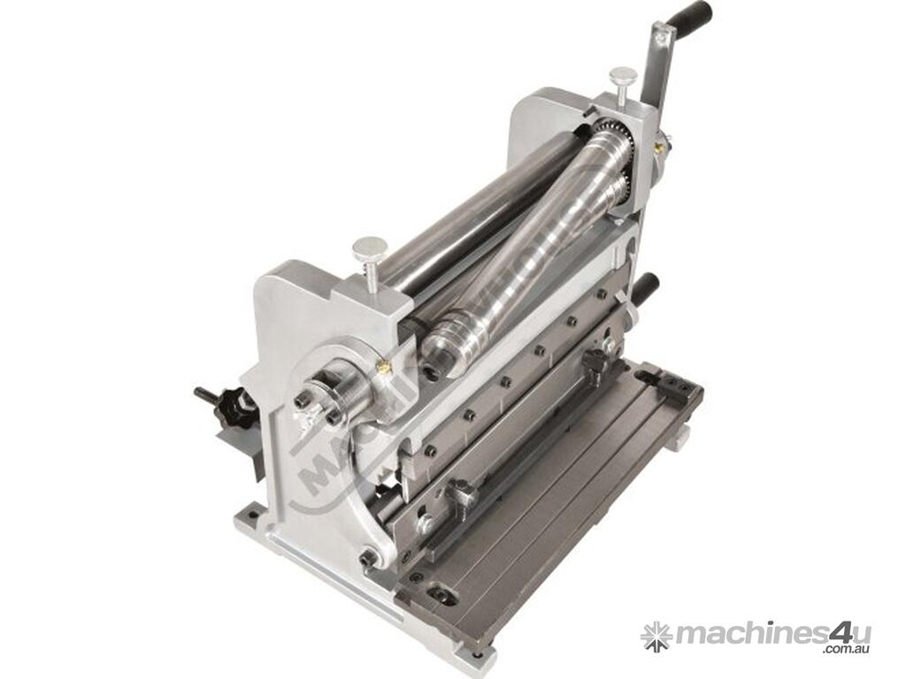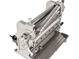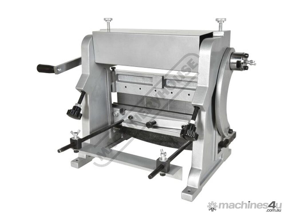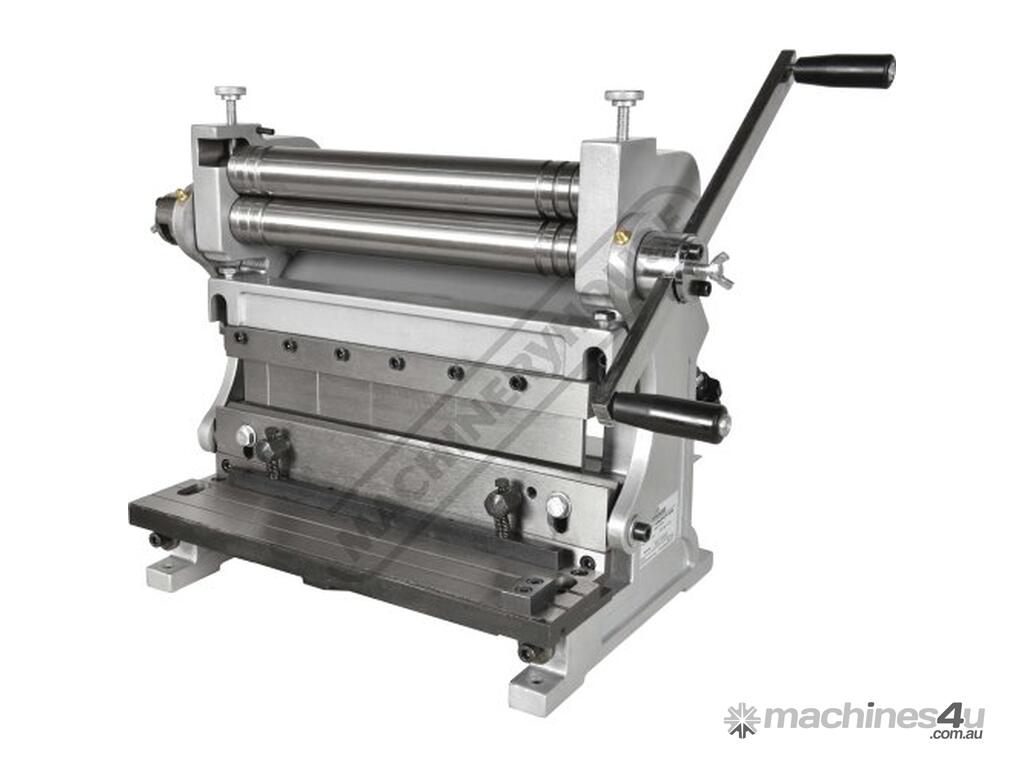 A compact three-function sheet metal working machine which will shear, roll and bend thin sheet material up to a maximum width of 300mm. The handle operates all three functions at the same time, but only one function can be used at one time - the rolls incorporates wiring grooves and are rotated whilst the bending and shearing functions operate via an eccentric cam. The pressbrake bending dies can be removed in sections to allow for partial bends to be formed and the top roll can be removed completely when forming closed cylinders. The maximum thickness capacity of 1mm for mild steel & 1.5mm for soft grade aluminium, This compact machine is perfect on small jobs and low production runs for the home engineer's workshop.