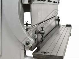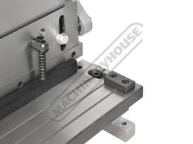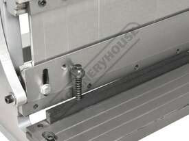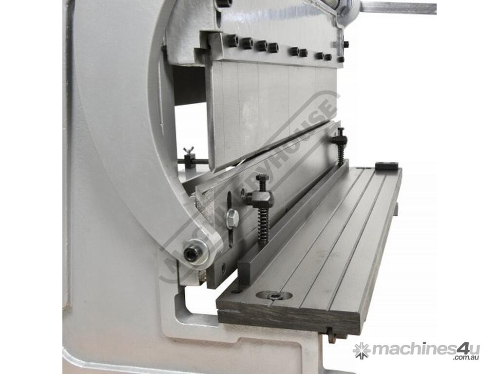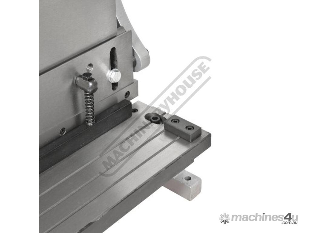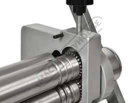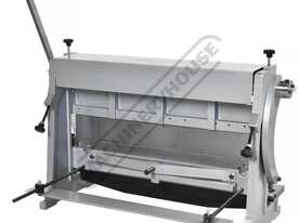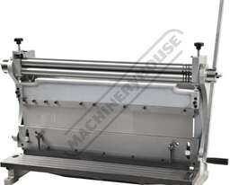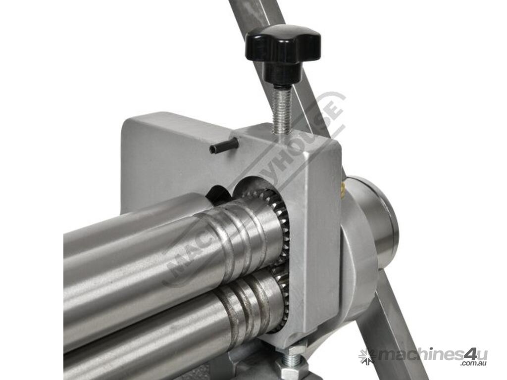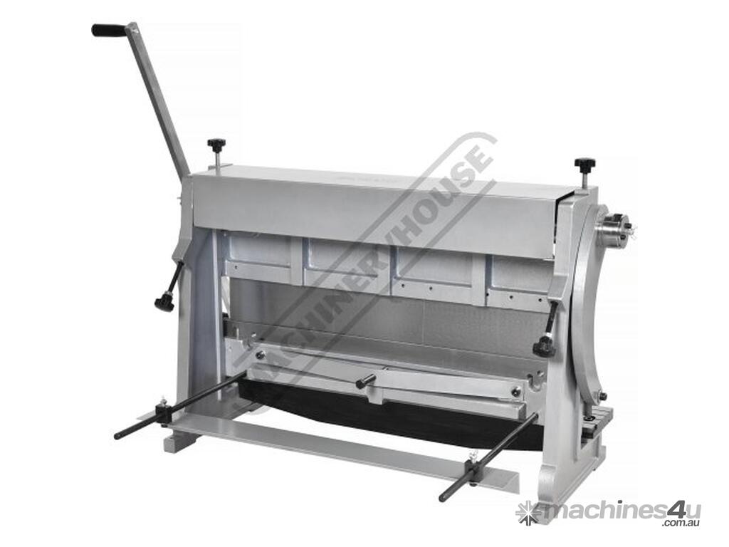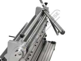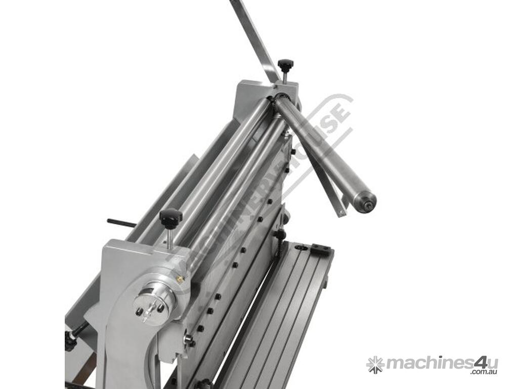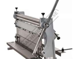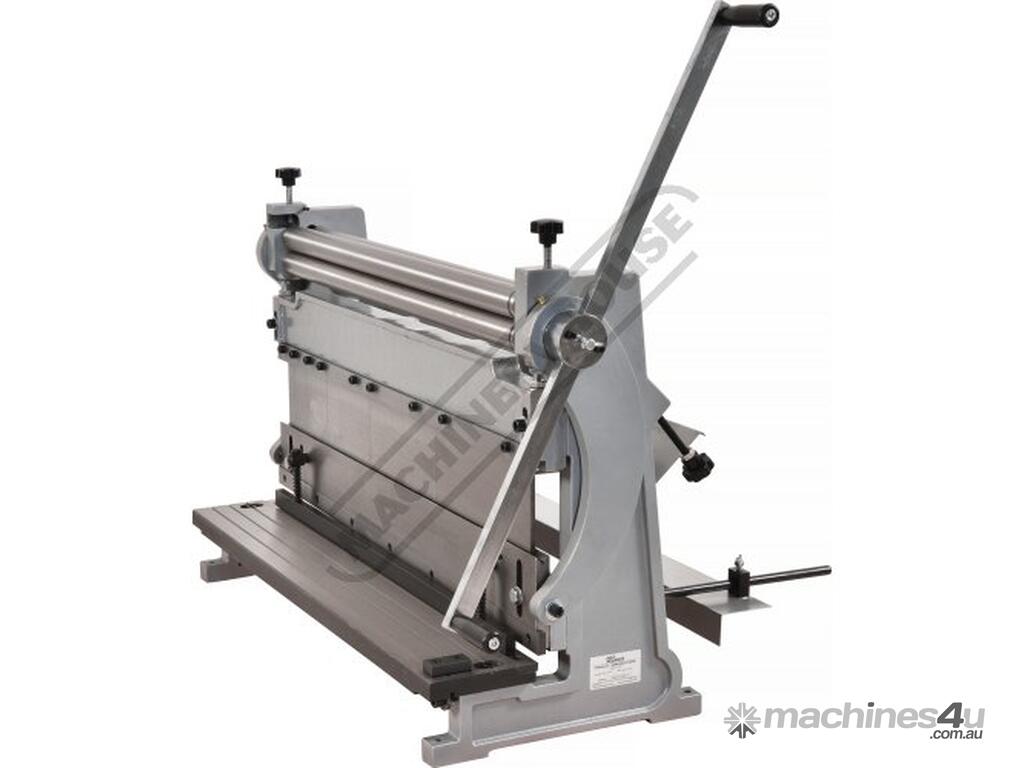 A compact three-function sheet metal working machine which will shear, roll and bend thin sheet material up to a maximum width of 760mm. The handle operates all three functions at the same time, but only one function can be used at one time - the rolls incorporates wiring grooves and are rotated whilst the bending and shearing functions operate via an eccentric cam. The pressbrake bending dies can be removed in sections to allow for partial bends to be formed and the top roll can be removed completely when forming closed cylinders. The maximum thickness capacity of 1mm for mild steel & 1.5mm for soft grade aluminium. This compact machine is perfect on small jobs and low production runs for the home engineer's workshop.